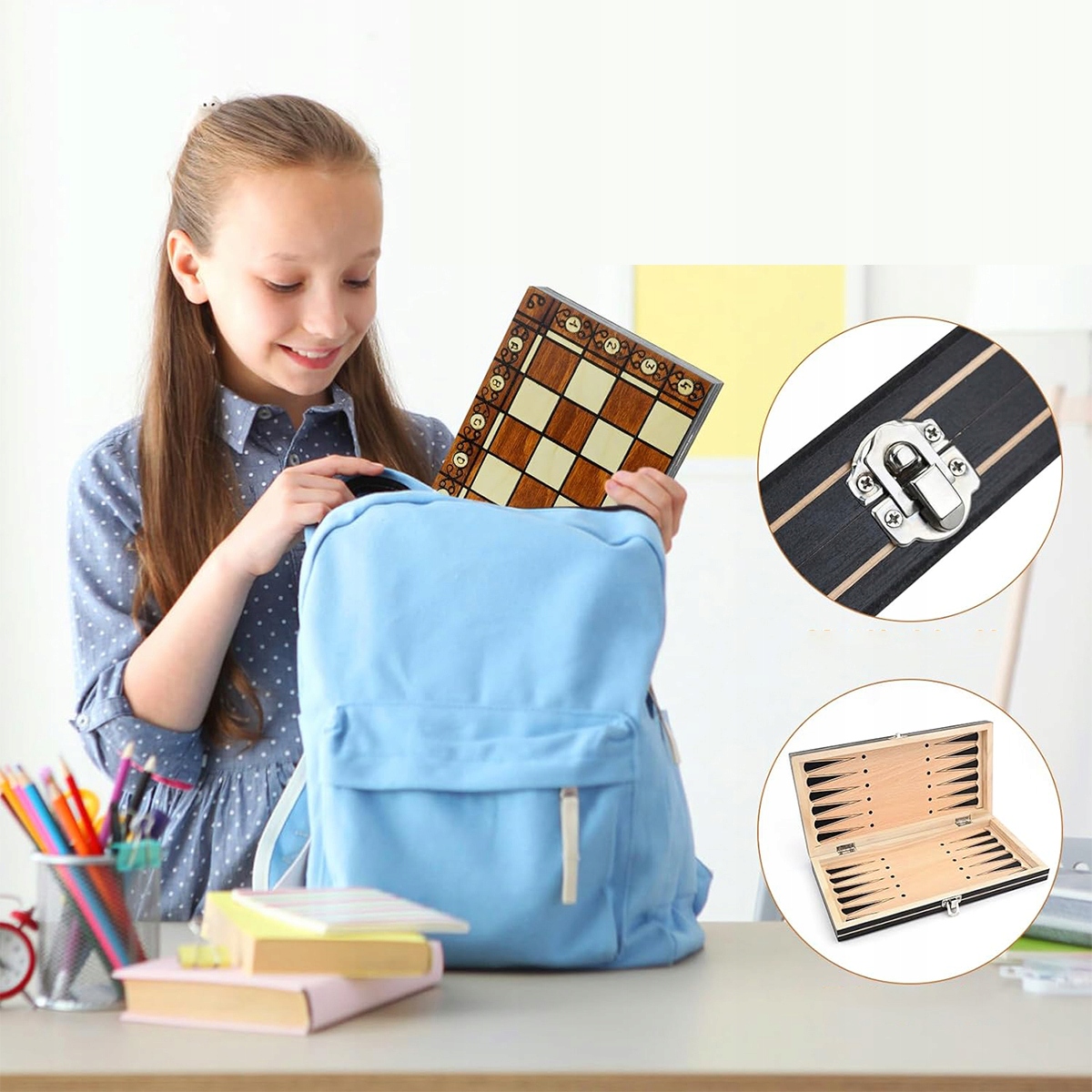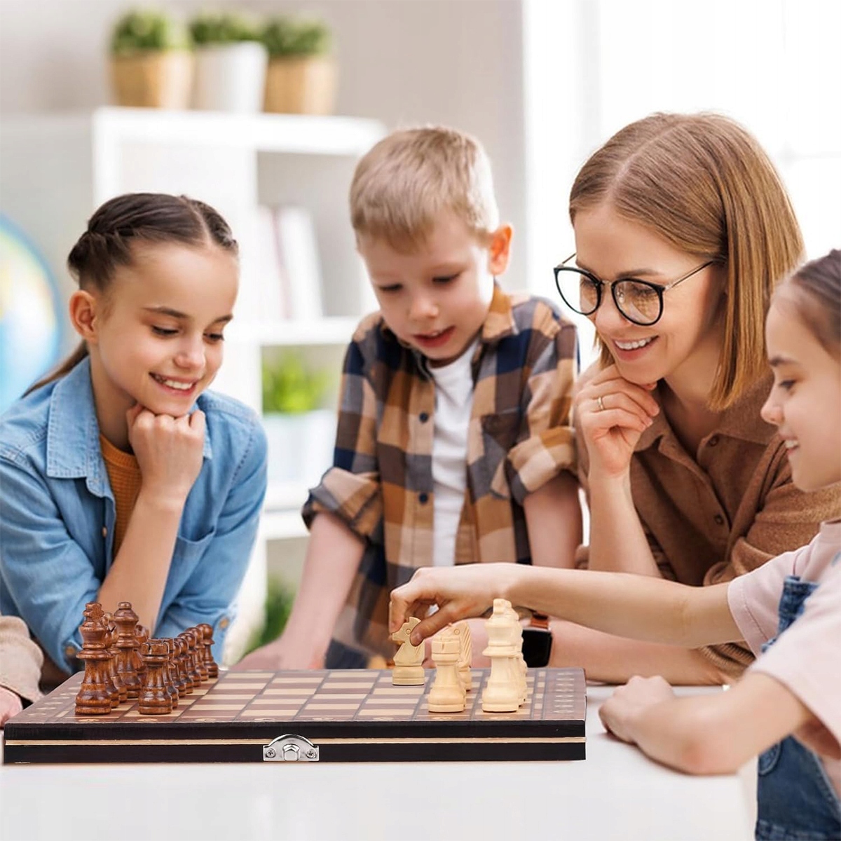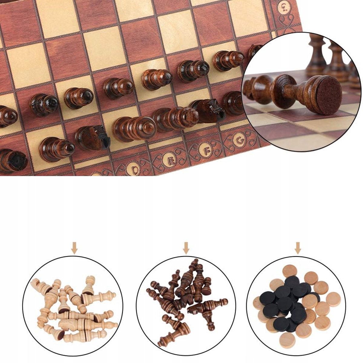 Шаховий набір має складну структуру, а коробку можна зберігати всередині шахових фігур. Їх можна носити з собою, вони не займають багато місця. Ви та ваші діти можете грати в шахи, щоб розвинути у дитини навички розв’язувати проблеми та прогнозувати, а також потренувати її пам’ять.