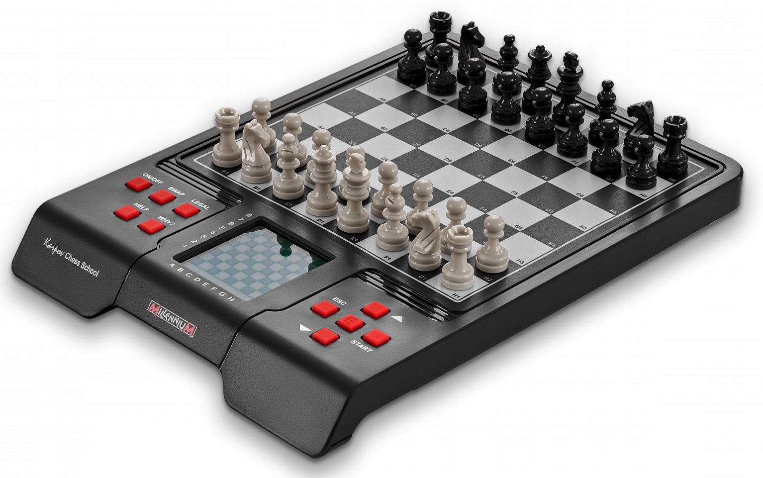 Щоб зробити гру в шахи справді приємною, Chess School оснащена високоякісною, простою у використанні шаховою дошкою з датчиками тиску. Чутлива дошка точно розпізнає кожен ваш рух, а великий дисплей з підсвічуванням чітко та прозоро відображає вправи, підказки та рухи. До набору Chess School отримала нові фігури в ексклюзивному дизайні MILLENNIUM, які не тільки чудово виглядають, але й приємно лежать у руці. Усі тексти меню та довідки, а також голосові підказки доступні англійською або німецькою мовами, що ідеально підходить для міжнародних користувачів. Крім того, інтегроване сховище фігур і живлення від батареї роблять Chess School ідеальною для подорожей - ви можете взяти навчання з шахів куди завгодно.