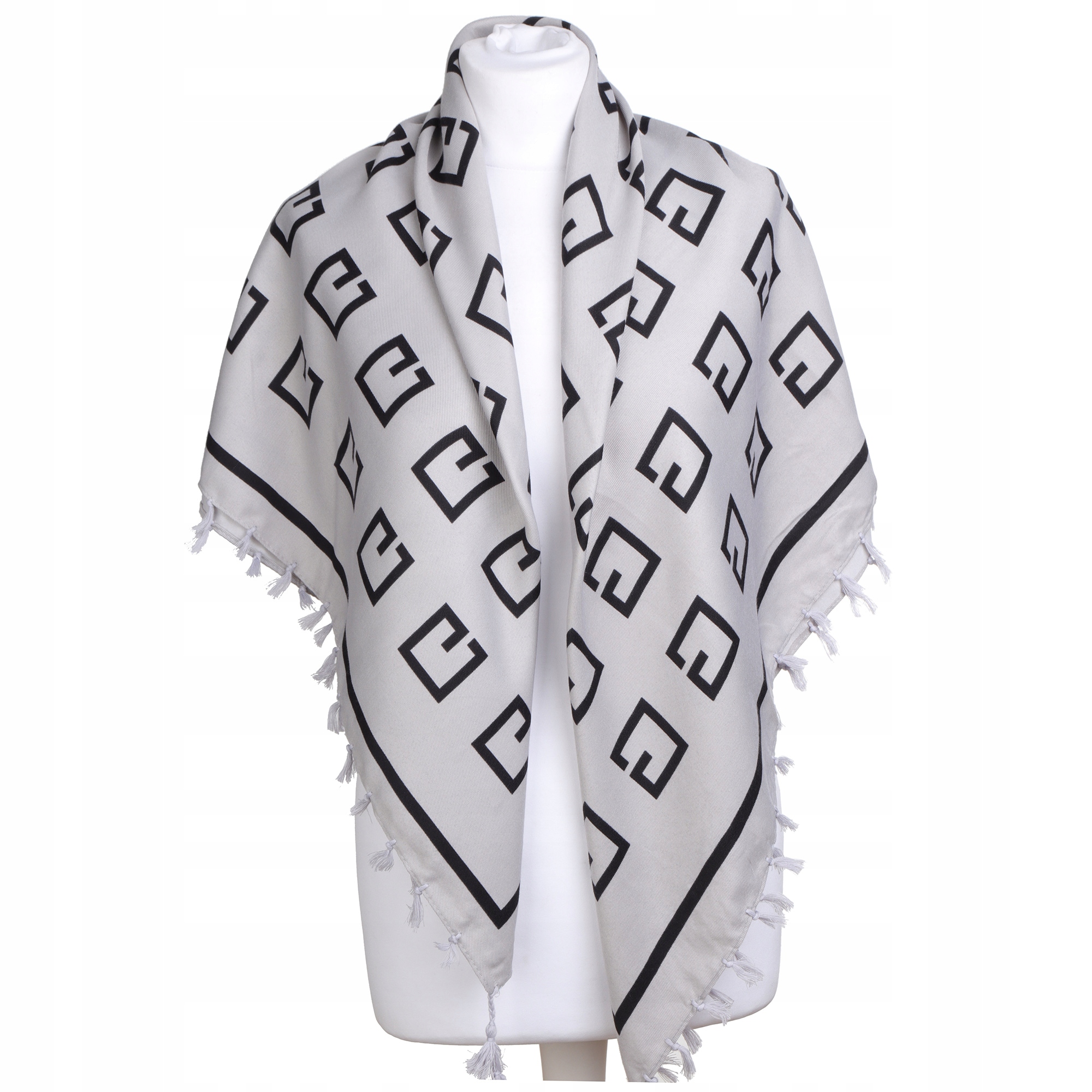 Шарф з геометричним малюнком - це поєднання класики та модерну. Ніжний сірий відтінок з чорними акцентами робить його ідеальним доповненням до будь-якого стилю - від повсякденного до більш елегантного. Легкий, повітряний матеріал забезпечує комфорт при носінні, а бахрома по краях додає шарму всьому. Універсальна форма і розмір дозволяють носити шарф різними способами - як класичний шарф, покривало або прикраса сумки.