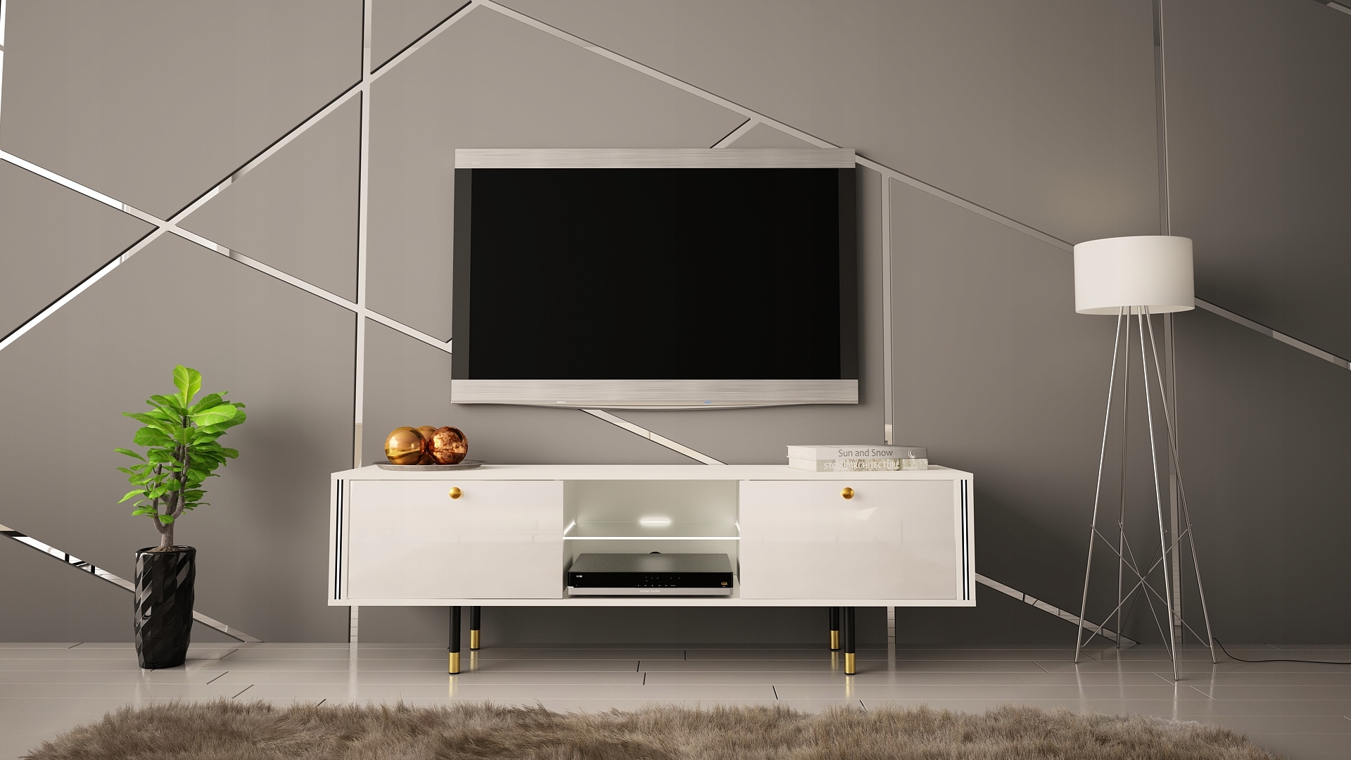 ТВ-тумба - це рішення, призначене особливо для сучасних віталень. Він одночасно мінімалістичний і елегантний, тому відповідає очікуванням найвибагливіших клієнтів. Він має скляну полицю для телевізійного обладнання, а також багато місця за блискучими фасадами для інших дрібниць.