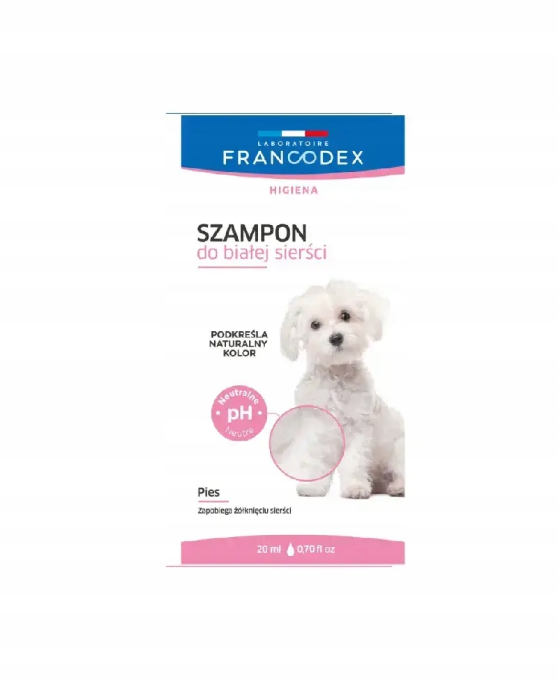 ФРАНКОДЕКС Шампунь для собак проти білої шерсті Саше 20 мл М'яка миюча основа, активні інгредієнти (вітамін В3, гліцерин, фітат натрію, синій барвник), кондиціонер (похідне гуарової камеді), консервант (бензиловий спирт), ароматизатор квітів бавовни, очищена вода.