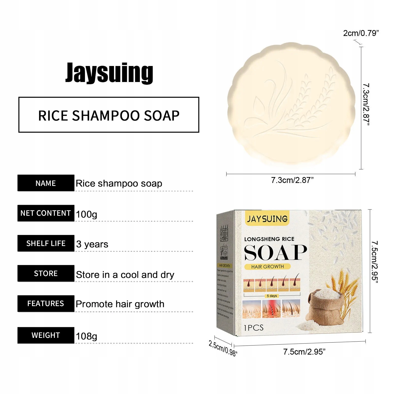 JAYSUING Rice Hair Growth Shampoo Moisturizing Soap Hair Regrowth Essence Anti Baldness Dandruff Removal Nourishing Repair Shampoo Bar 100g