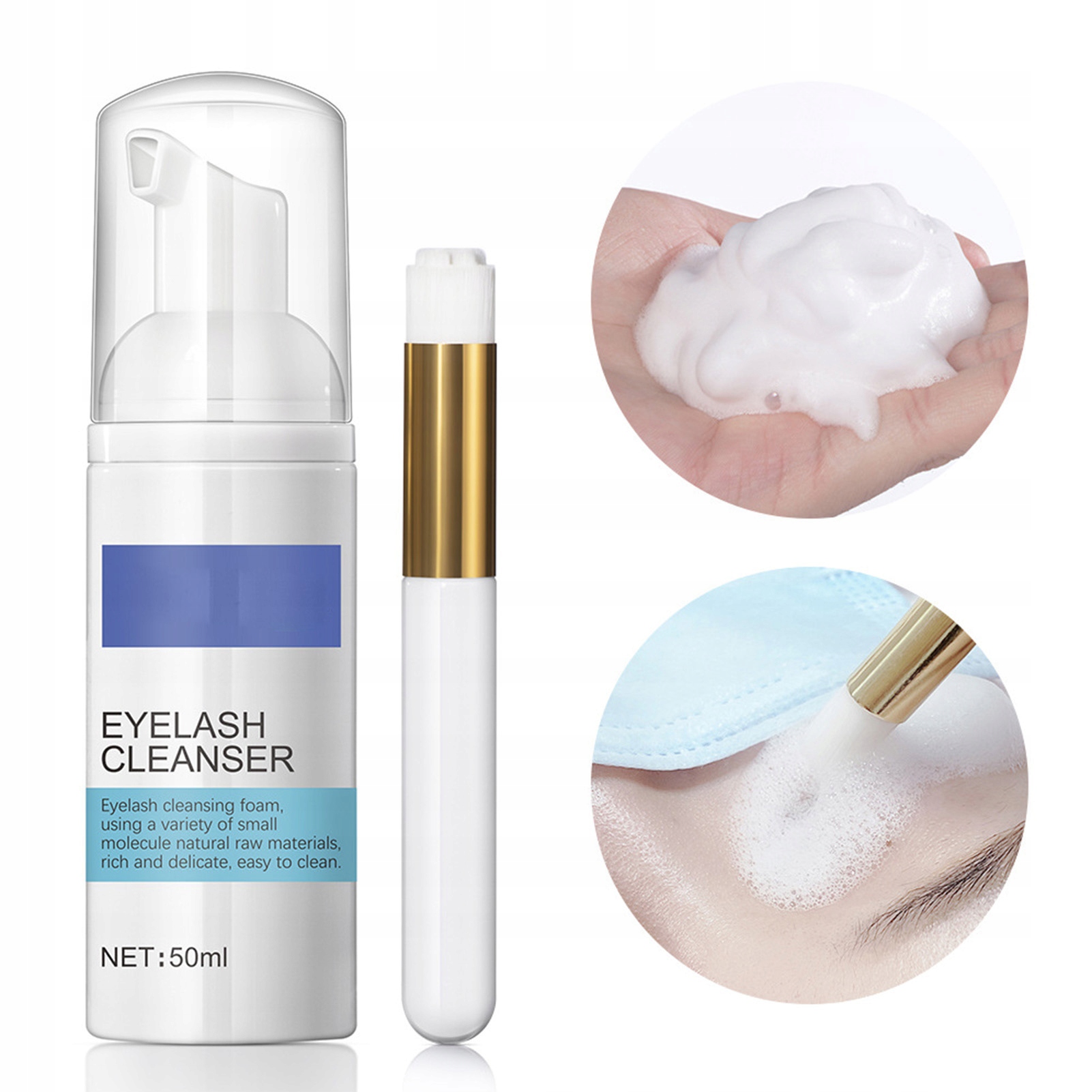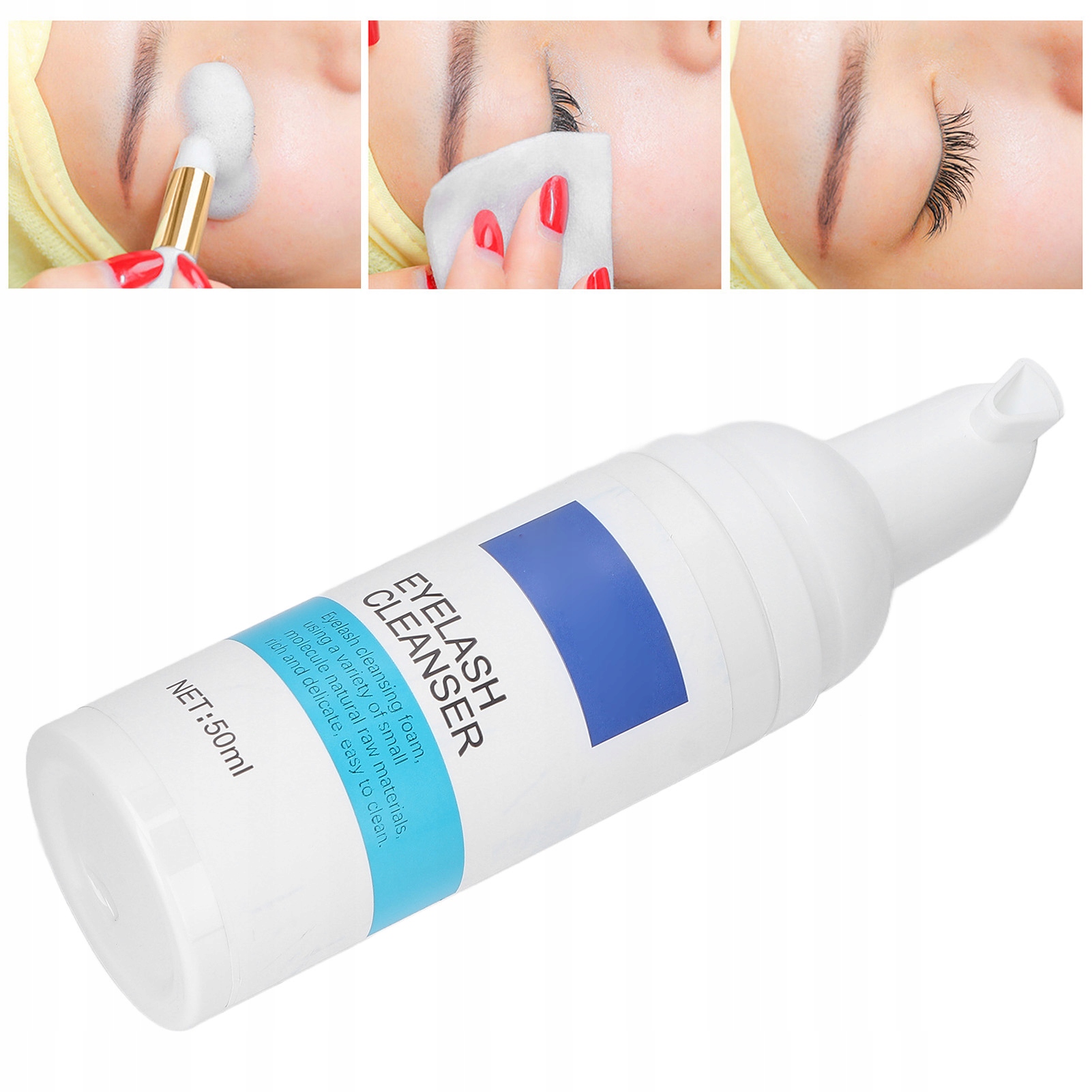 ⏺ Просто видавіть відповідну кількість піни на вії, скористайтеся щіточкою для очищення, закрийте очі та промийте водою.