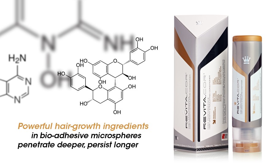 Біоадгезивна технологія: унікальний кондиціонер Revita COR® містить мікросфери з біоадгезивними властивостями, які прилипають до шкіри голови та волосся. Revita.COR багата багатьма речовинами, ефективність яких науково доведена у стимулюванні та захисті волосся.