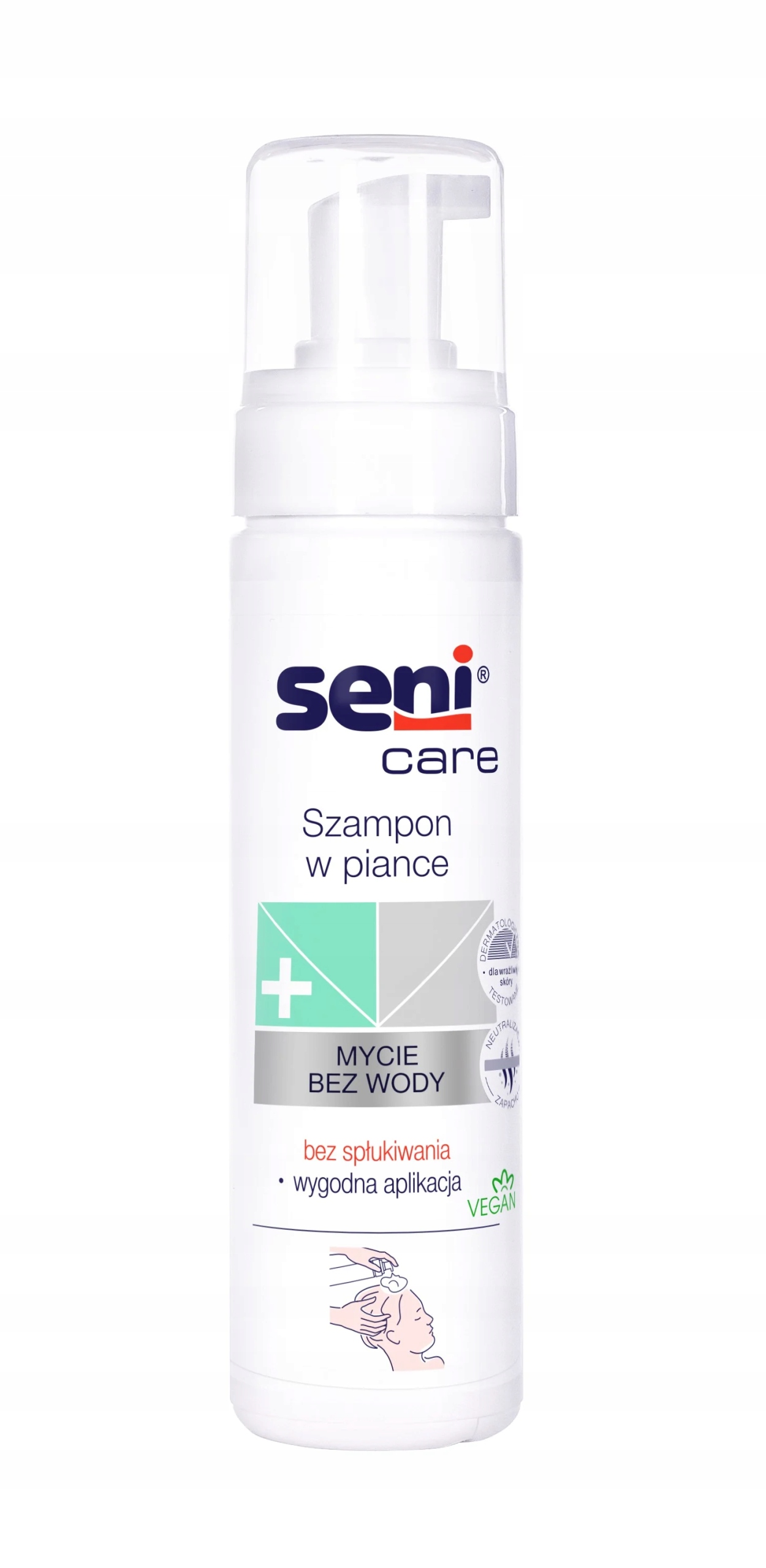 Один із них — Шампунь-пінка для миття волосся без води. Дозволяє доглядальнику швидко вимити шкіру голови і волосся, нейтралізувати неприємні запахи і живити епідерміс. На відміну від сухих шампунів, піна-шампунь Seni Care розчиняє забруднення, залишаючи волосся не тільки оновленим, але й очищеним. Препарат значно полегшує роботу медичного персоналу, який може швидко та без використання води забезпечити чистоту та комфорт пацієнта.