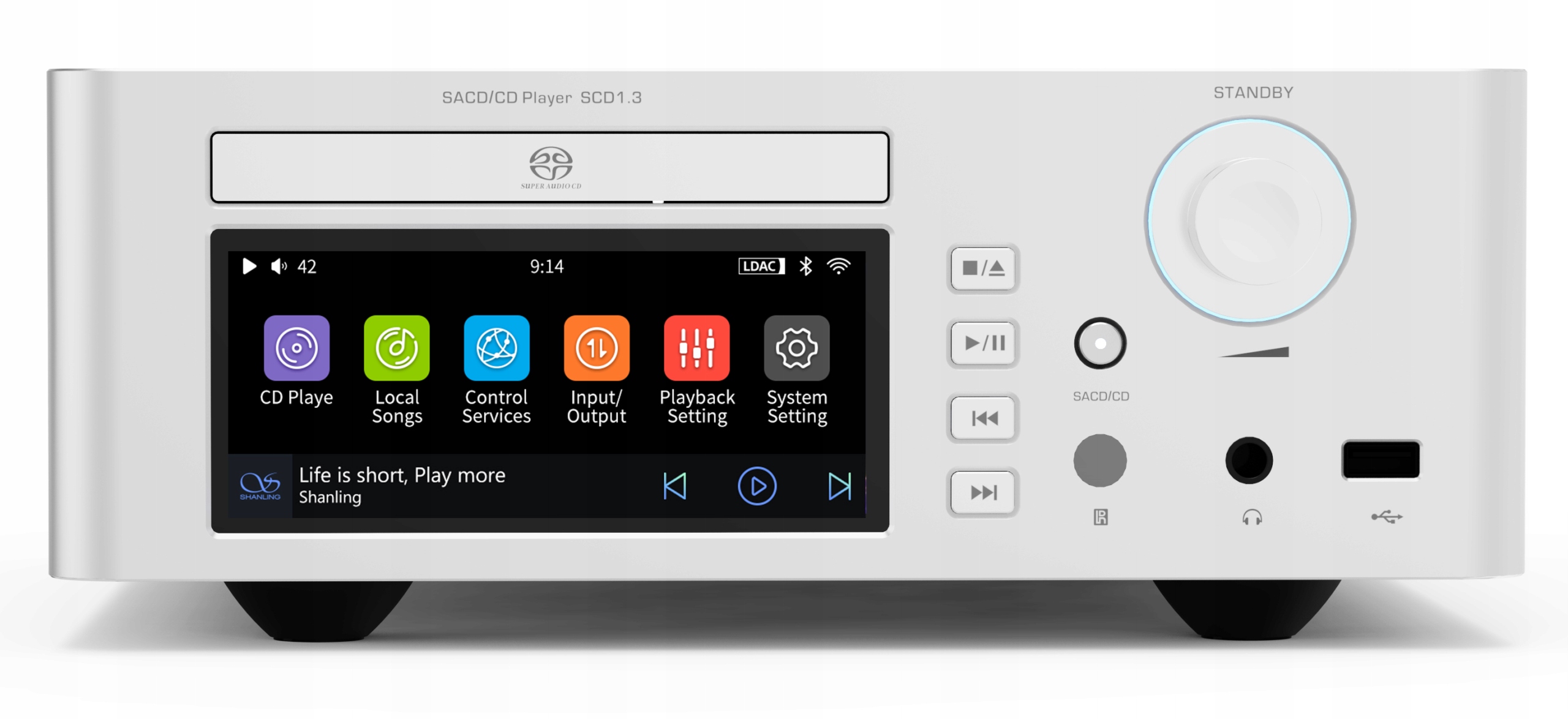 Shanling SCD1.3 є найкращим програвачем SACD (Super Audio Compact Disc), який виділяється його дивовижне співвідношення ціни та якості. Модель заснована на відомому накопичувачі Sanyo HD870 з висувним лотком для дисків і перевіреною системою DSP MediaTek MT1389EE і має набір функцій, які зазвичай недоступні в пристроях цього типу. Shanling SCD1.3 має флагманський чіп DAC AKM AK4499EX із відповідним регулятором AK4491, підсилювач для навушників із виходом 6,35 мм, 5-дюймовий сенсорний екран і функція відтворення аудіофайлів із USB-пам’яті.