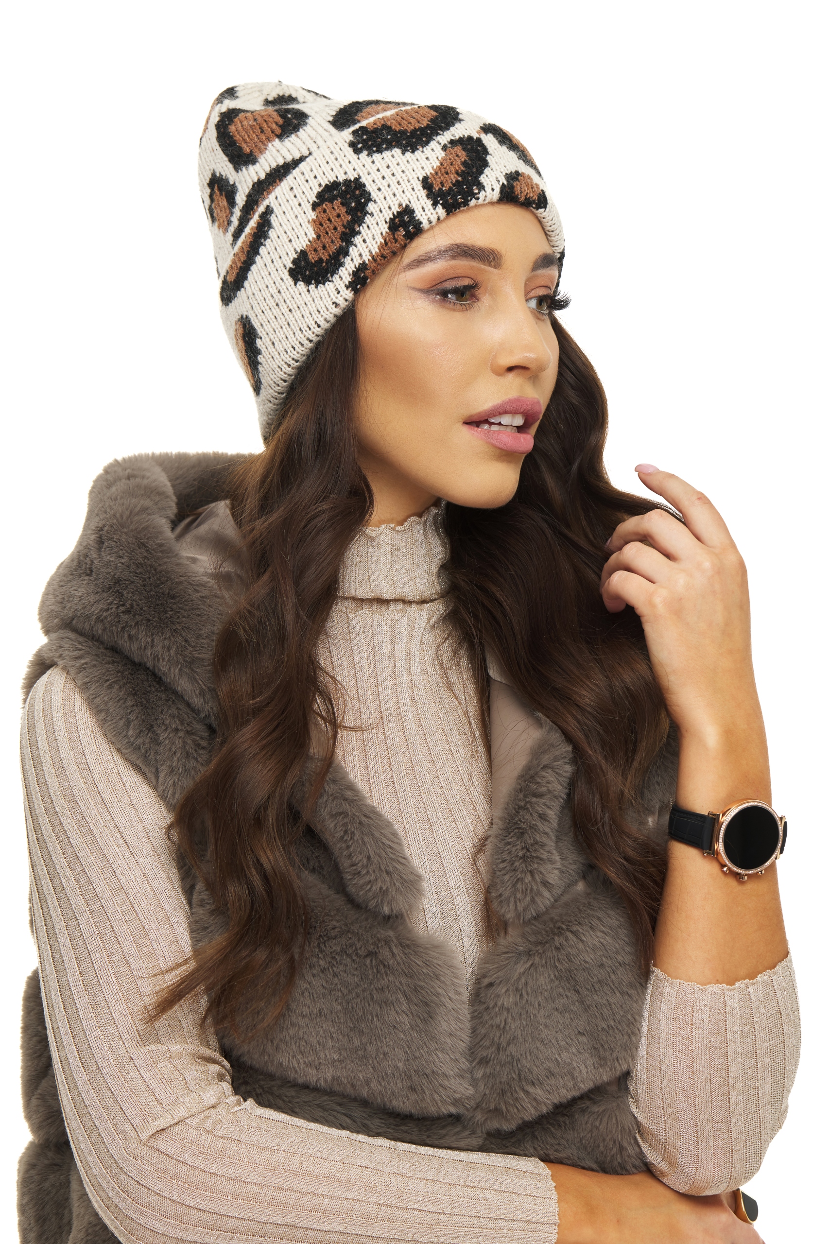 ШАПКА БІНІ, щільна в'язка, леопардовий принт, світло-бежевий