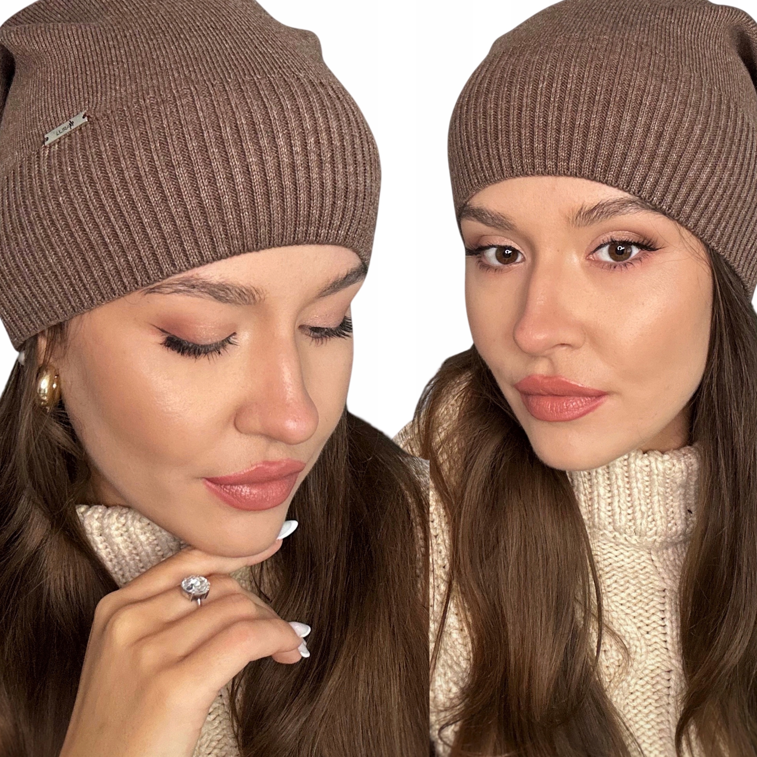 ✅ Шапочка без рулону, м’яко спадаюча, з цікавим шиттям ззаду та делікатною рубчиком спереду.