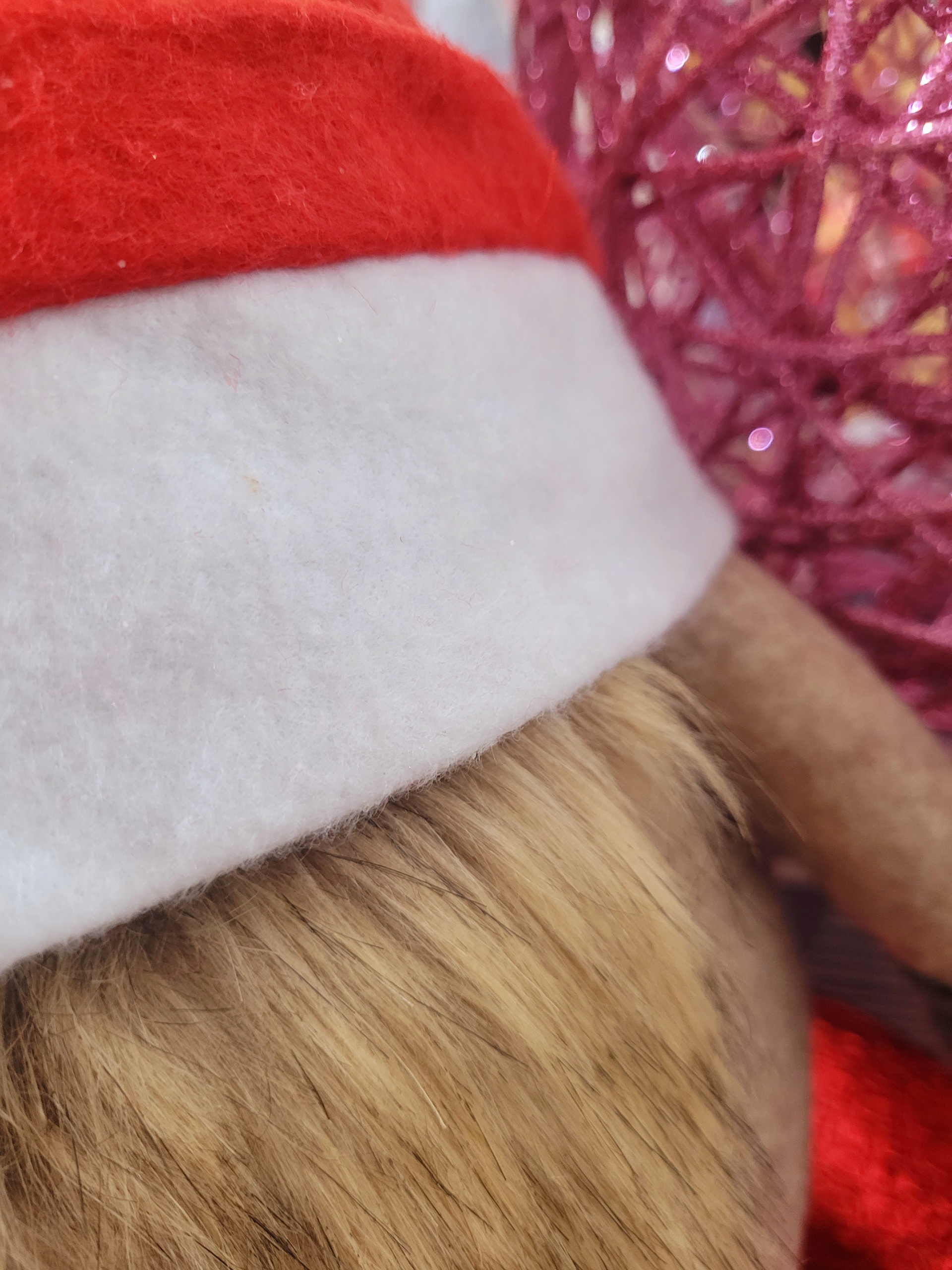 Традиційна різдвяна шапка Санта-Клауса з милими білими косами, перев’язана червоною стрічкою.