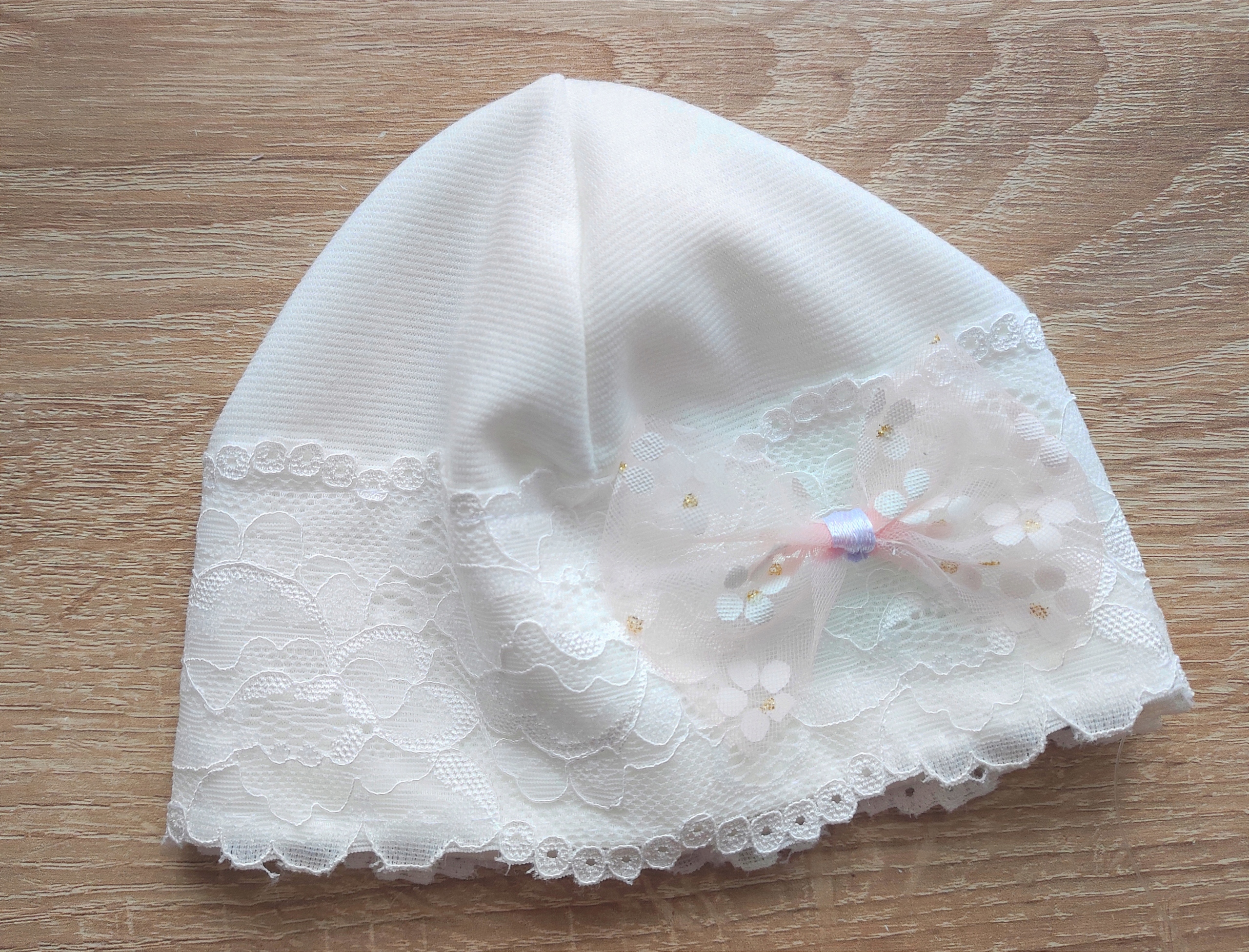 Шапка з більш щільної м'якої тканини, прикрашена красивим еластичним мереживом і бантом.