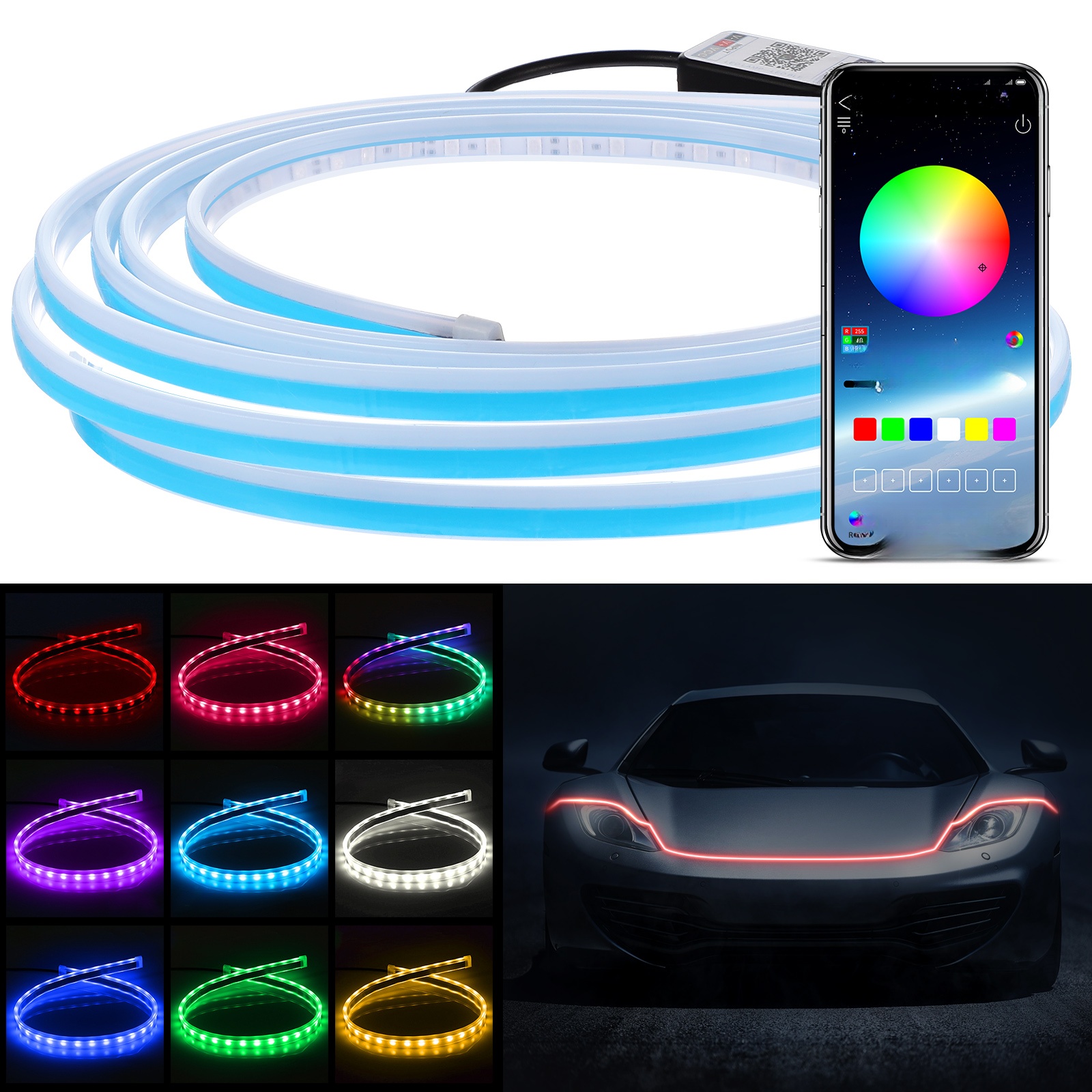 ✅Смугу підсвічування капота автомобіля легко встановити, а неруйнівну установку можна приєднати безпосередньо до слота двигуна.