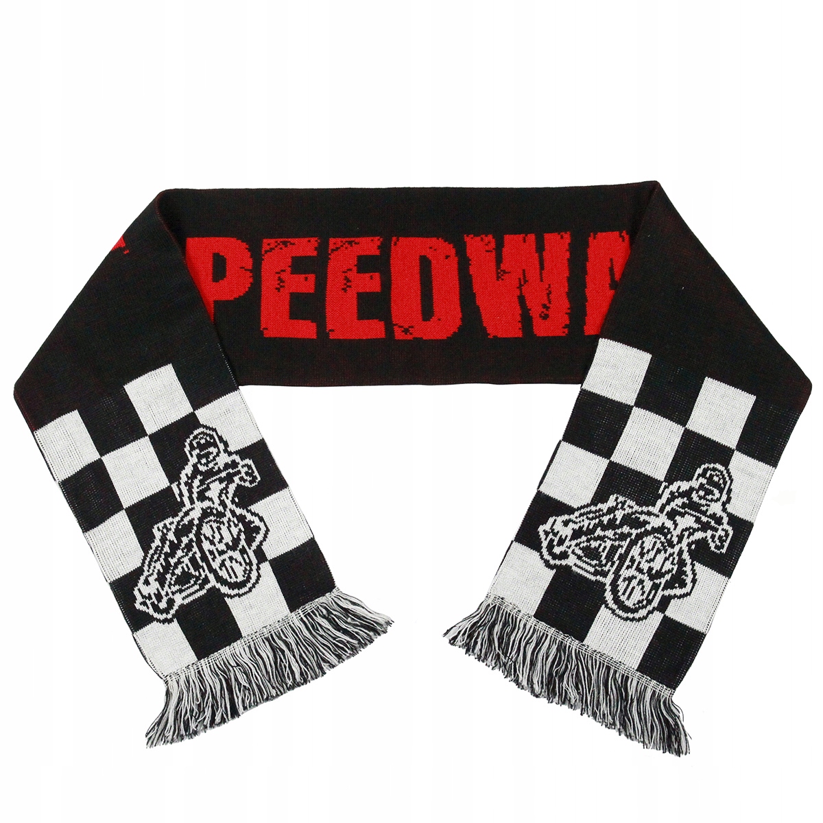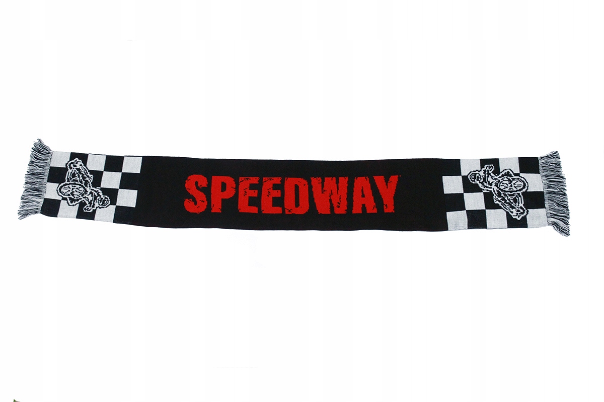 Великий червоний напис SPEEDWAY на чорному фоні , з чорно-білою шаховою дошкою на кінцях і такими ж бахромою.