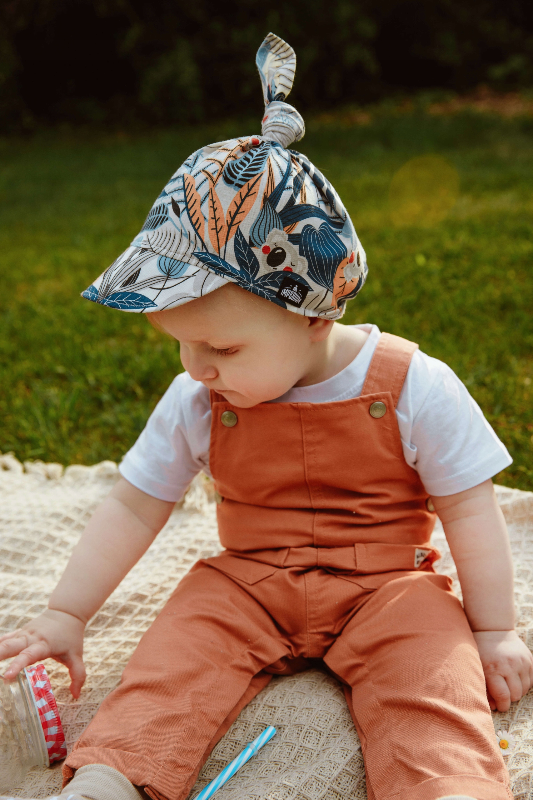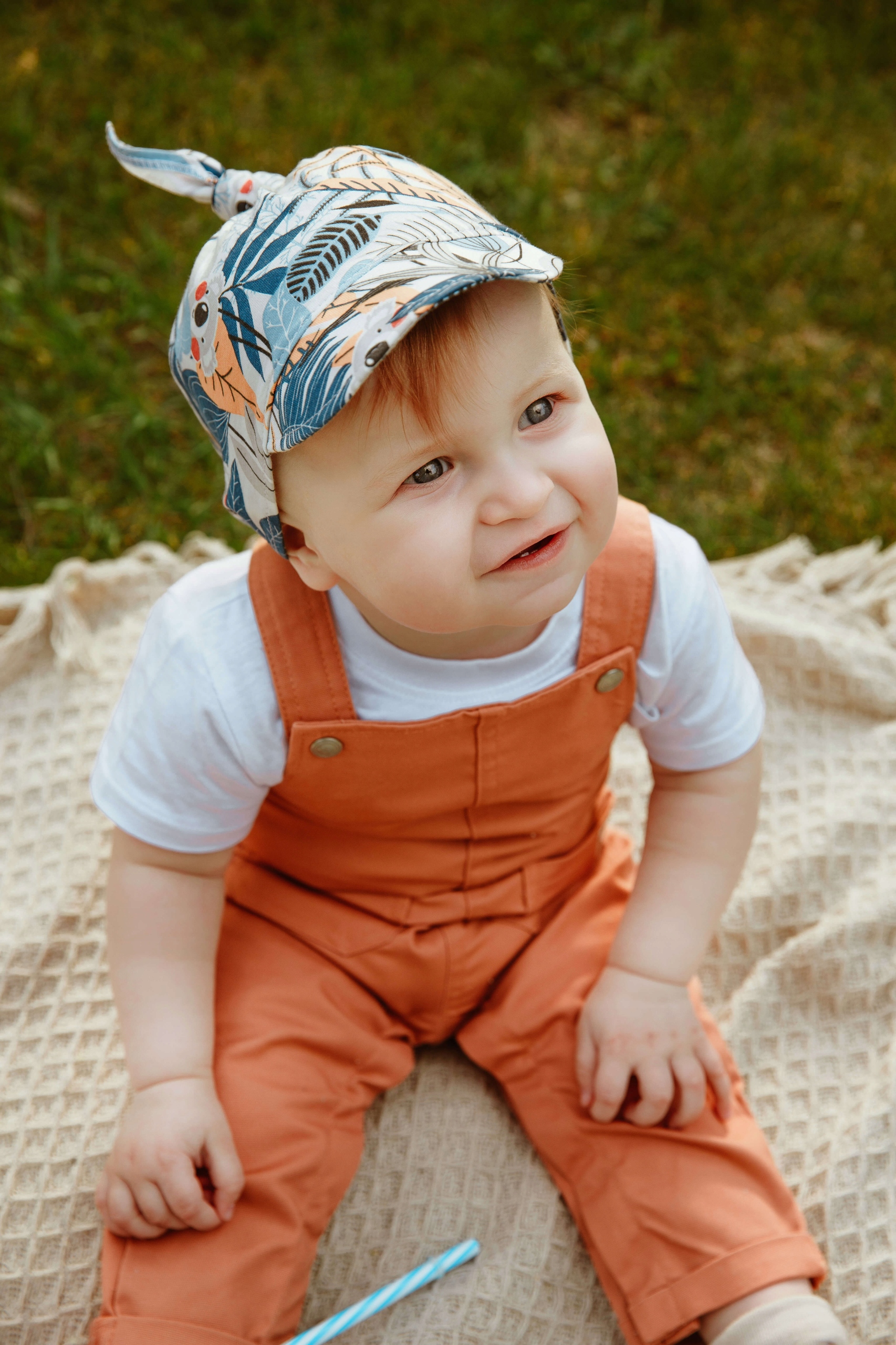 - Можливість регулювати розмір - шарф можна зав'язати вузлом зверху на глибину, яка підходить для голови дитини, а окружність голови регулюється зав'язкою ззаду (як на фото) - завдяки цьому кожен з батьків може ідеально підібрати зав'язку до окружності голови малюкащоб шарф не щипав і не заважав грати.