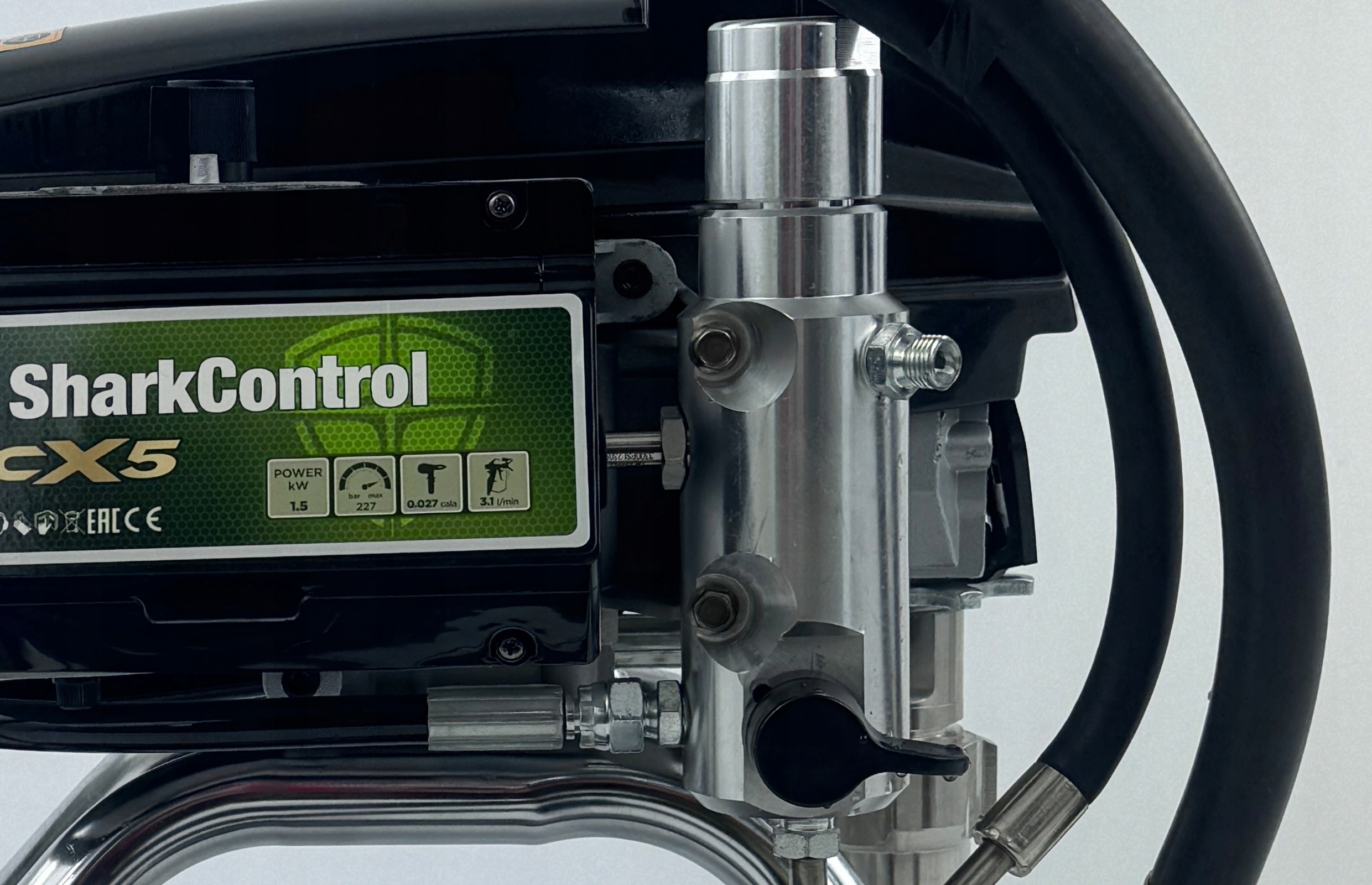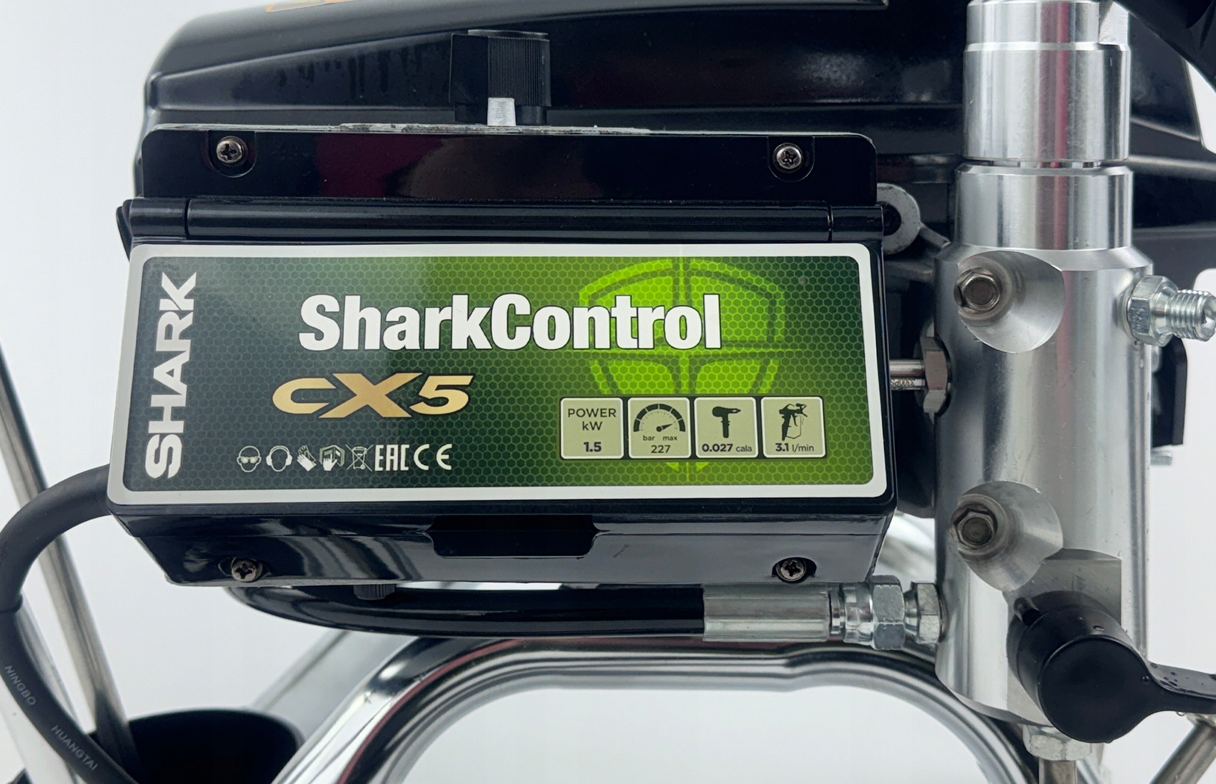 - Регулювання тиску - SHARK CX5 має регулювання тиску за допомогою системи SharkControl і міцного, чіткого дисплея, який дозволяє регулювати тиск відповідно до типу фарби і сопло та підтримуйте його на постійному рівні. Для роботи не потрібен пневматичний компресор, достатньо розетки 230В, а фарбу можна брати з будь-якої ємності