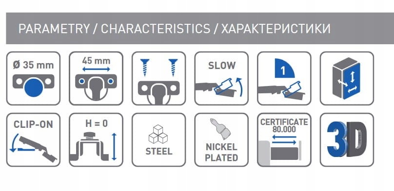 - Характеристики продукту: Гідравлічна петля з тихим закриванням, система легкого зняття CLIP-ON, сучасний дизайн, сертифікат на 80 000 циклів
