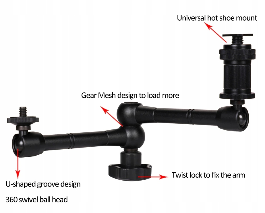 Дозволяє кріплення різних типів фото-відео аксесуарів, наприклад, ламп, мікрофонів, моніторів, рекордерів тощо для фотоапаратів, монтажних установок або роликових ковзанів.