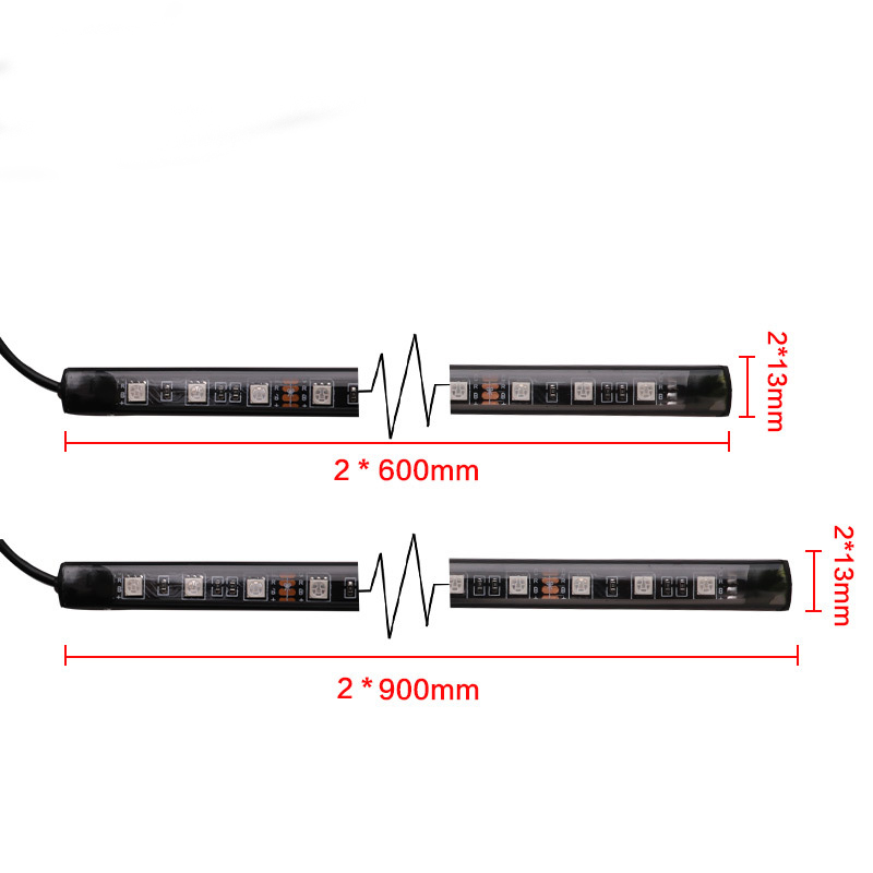 Чотири смужки керуються за допомогою бездротового пульта дистанційного керування. Планки гнучкі, що полегшує установку під шасі автомобіля. Їх також можна встановити в багажнику, на дверях багажника, під решіткою тощо. Вони виготовлені з ПВХ матеріалу з двостороннім скотчем для легкої установки.
