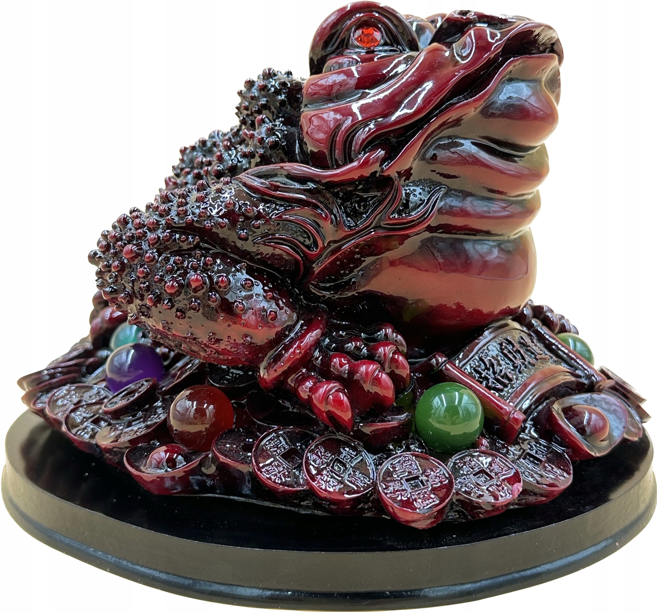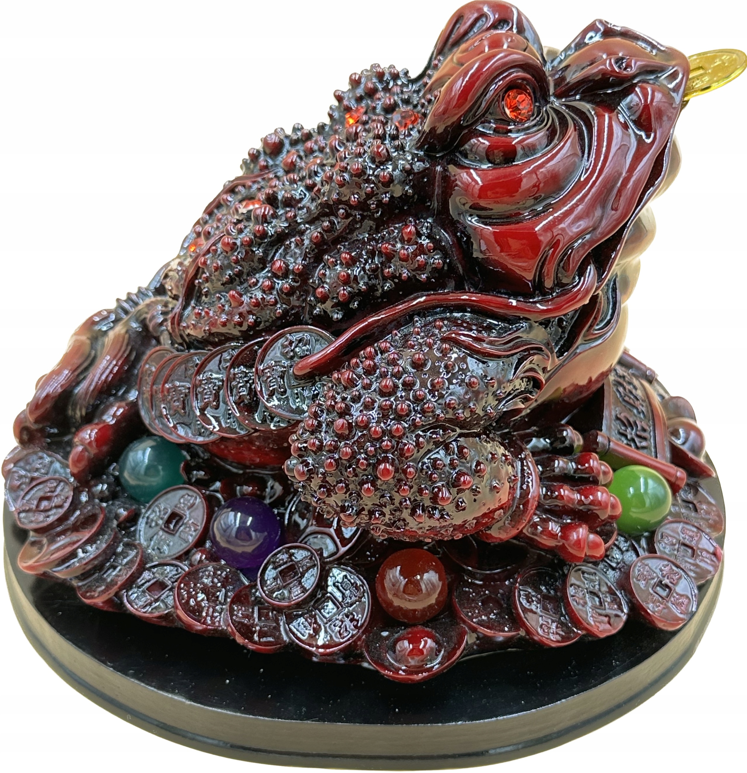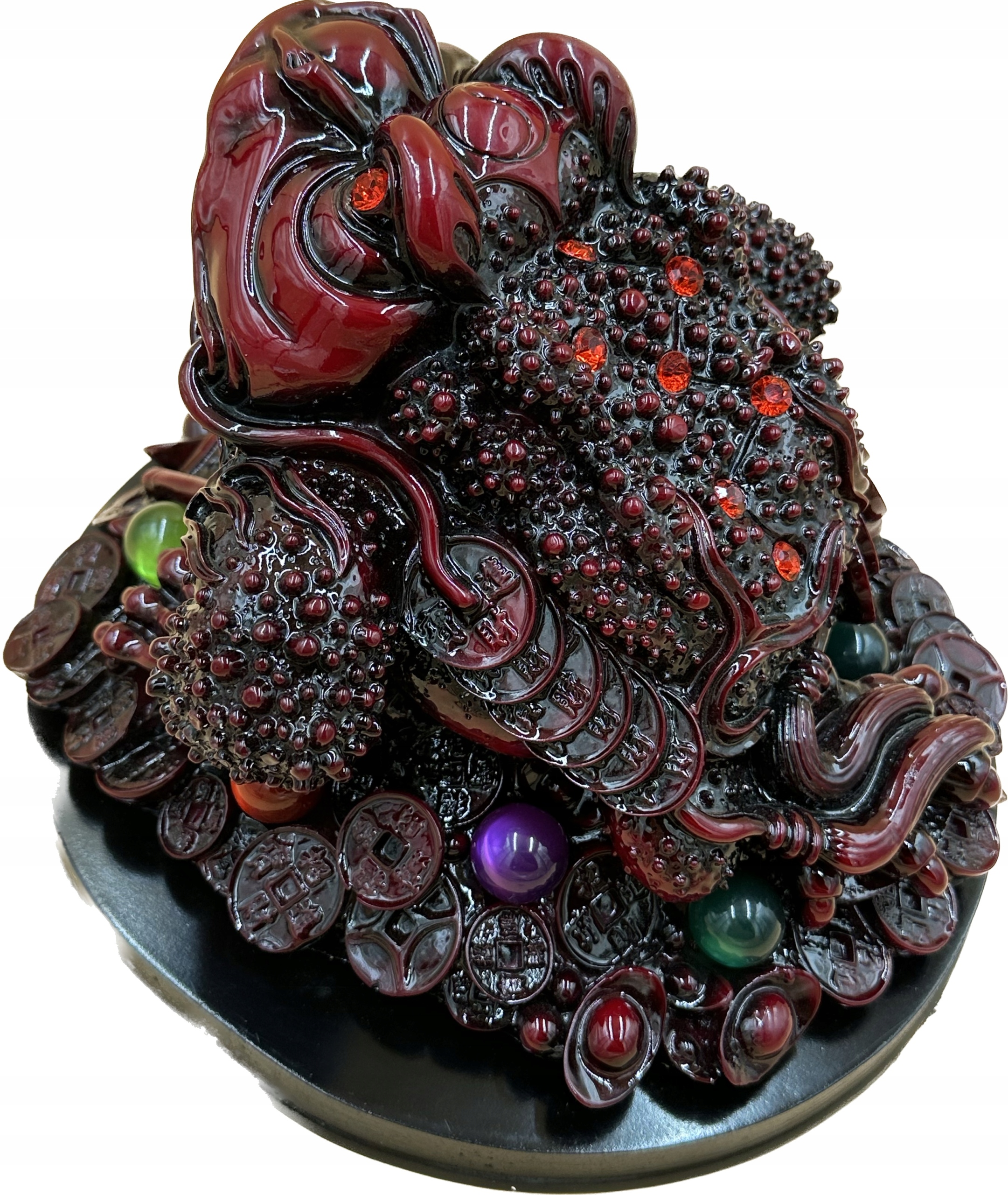 - Традиційний китайський символ багатства – жаба з червоними очима, що сидить на купа традиційних китайських грошей із монетою в роті (металева монета включена).