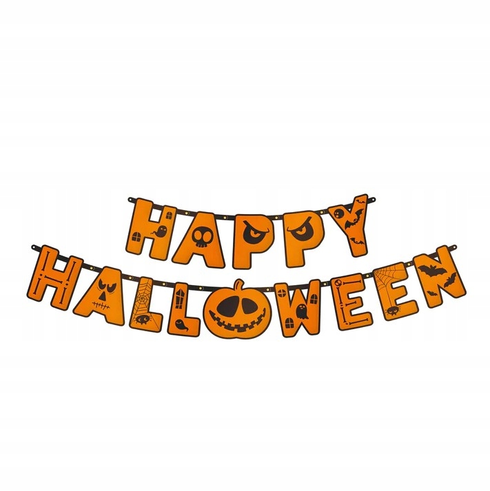 Банер складається з літер, що утворюють слова HAPPY HALLOWEEN. кожна з помаранчевих літер додатково прикрашена чорною графікою символів Хелловіна, таких як привиди, павуки, черепи, кістки або кажани. Крім того, буква О схожа на гарбуз.