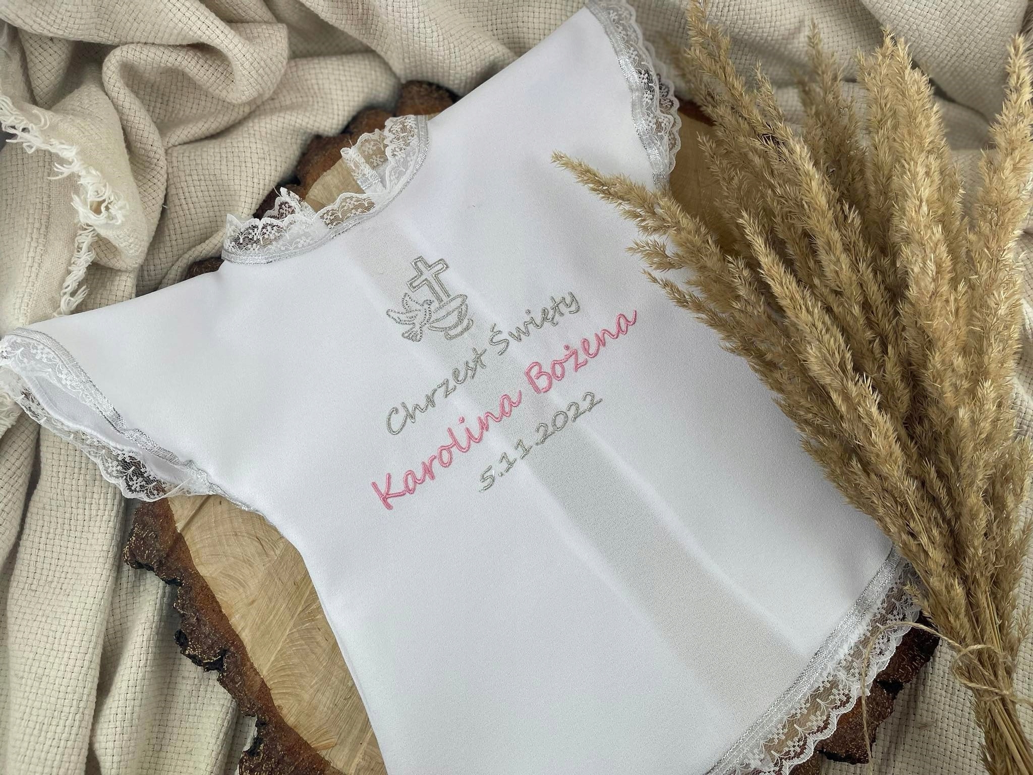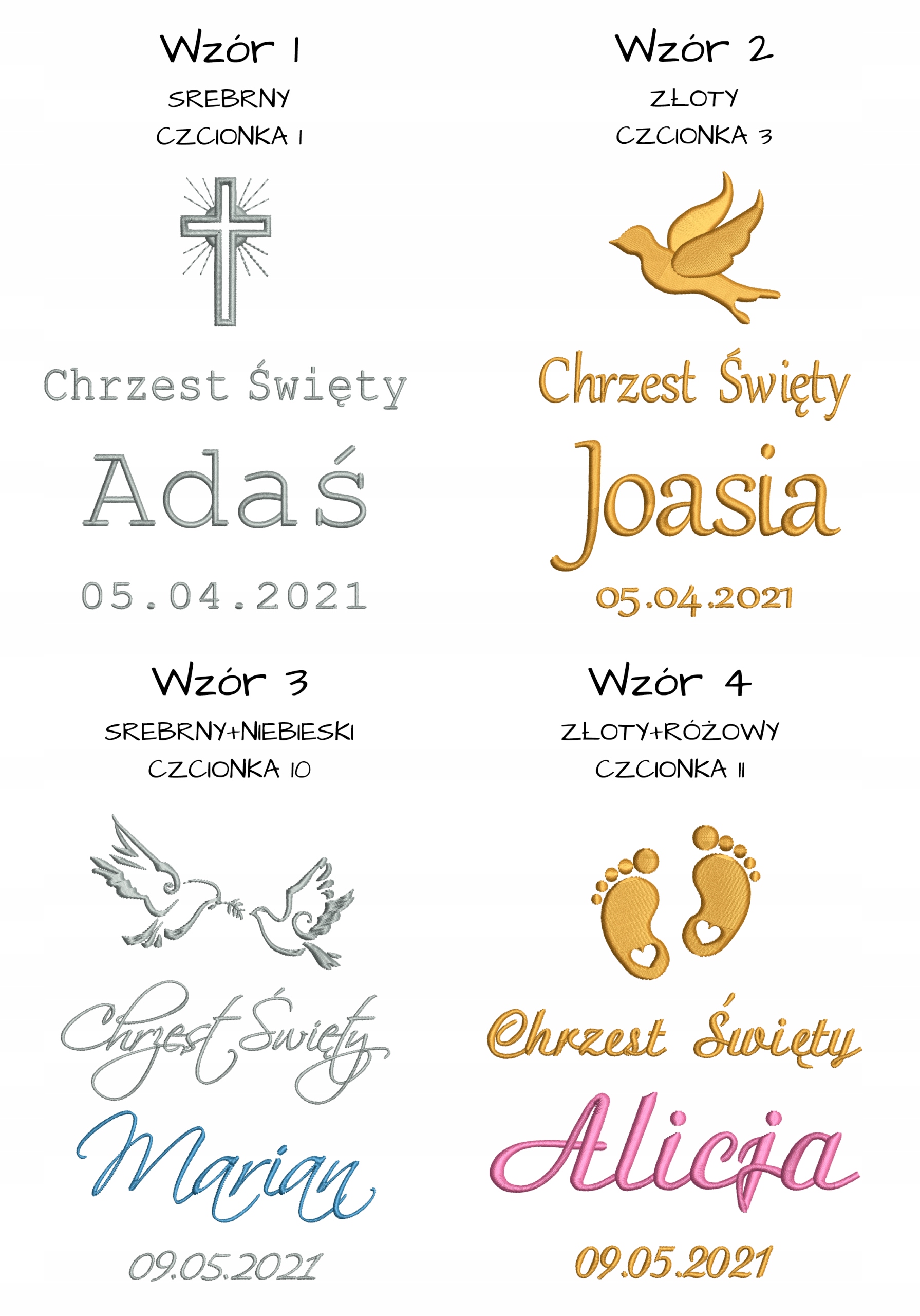 Приклад: мантія із золотою стрічкою, мотив 7, шрифт 4, домінуючий колір 6, колір імені 4, імена Kacper Michał, дата хрещення 25/04/2021