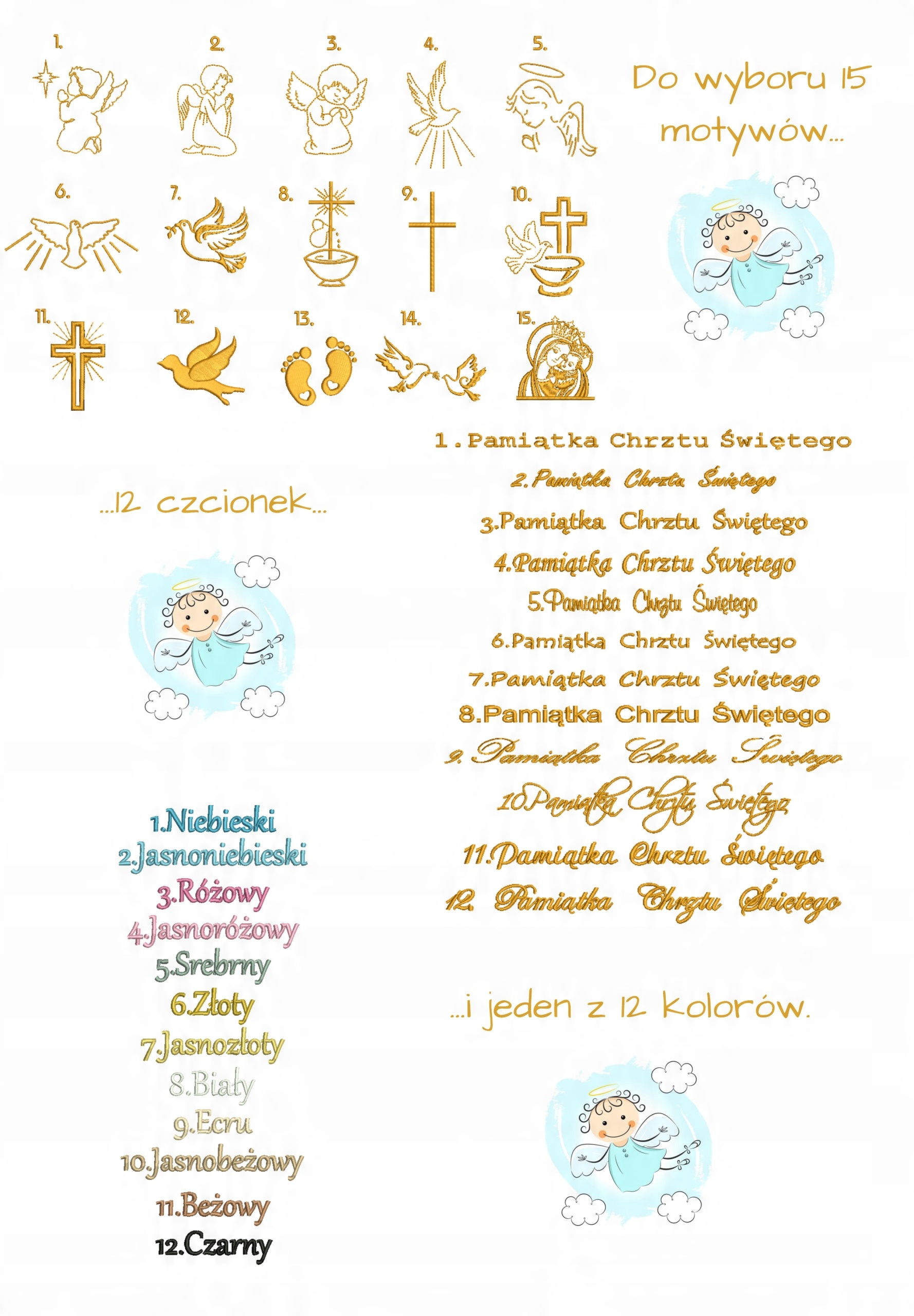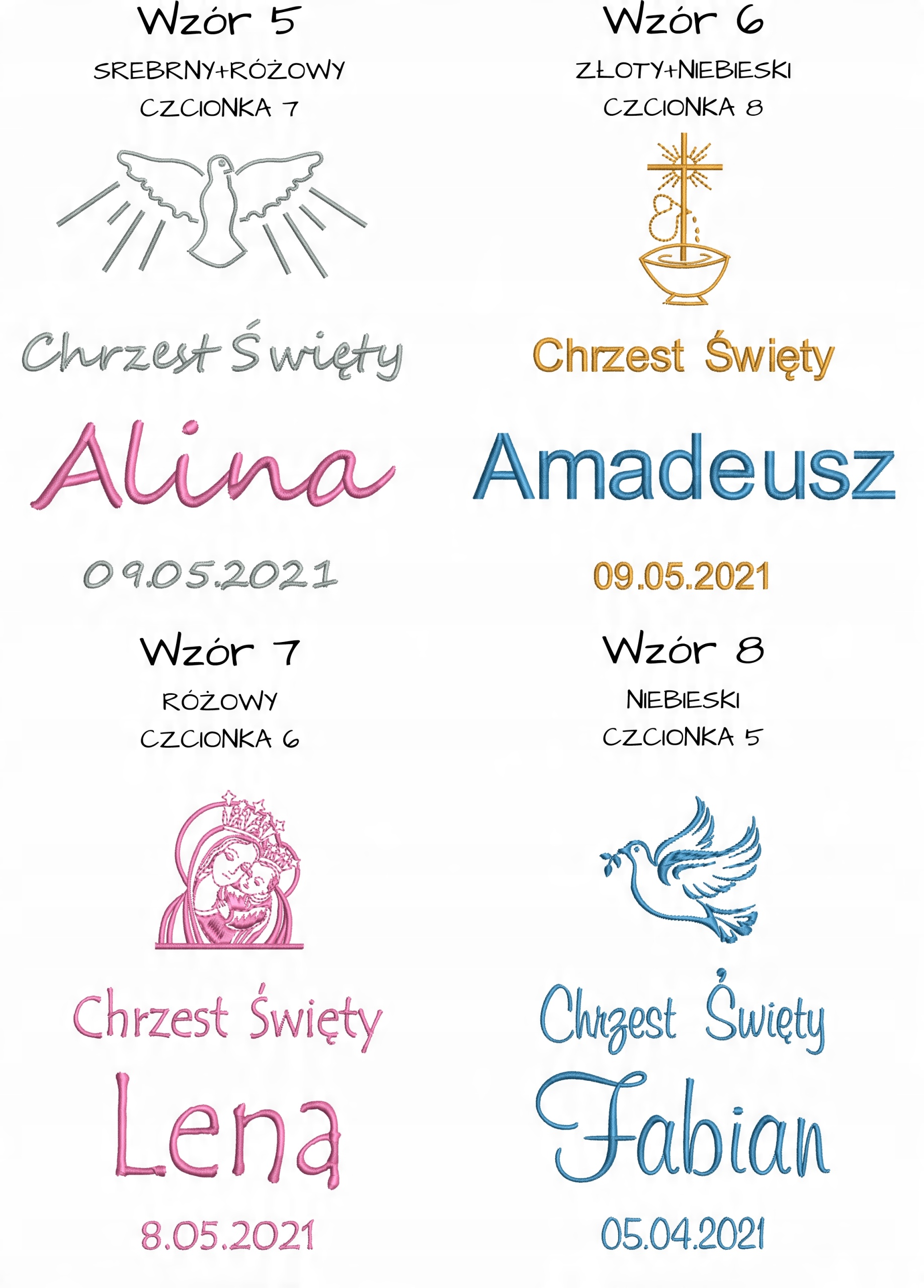 Приклад: мотив мантії №. 7, шрифт 4, домінуючий колір 6, колір імені 4, імена Kacper Michał, дата хрещення 25/04/2021