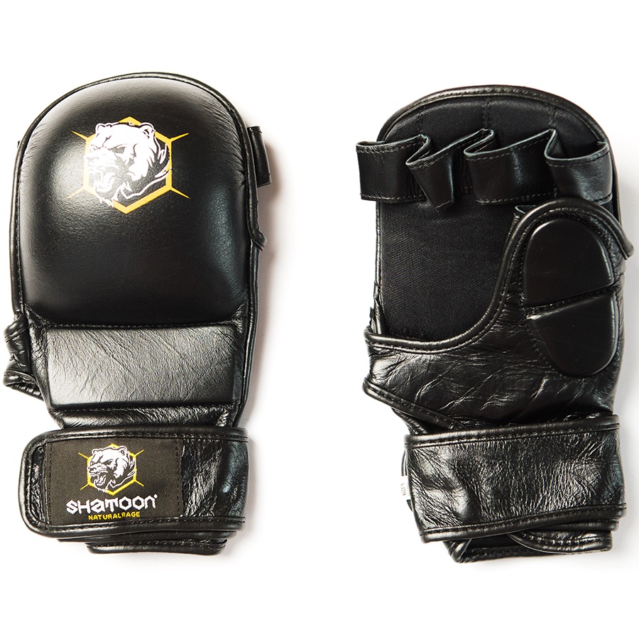 Шатун ММА шкіряні рукавички - спаринг чорні рукавички виготовлені з високоякісної натуральної шкіри , що забезпечує багато років тривалості. Вони мають оголену внутрішню частину, яка не тільки покращує вентиляцію, але, перш за все, також дозволяє захопити клопоту під час бойових прийомів на першому поверсі. Використовувана додаткова кришка великого пальця, яка захищає його від пошкоджень, потертості. Shatoon MMA Sparrings мають більш тривалий кріплення ремінця з подвійним липучком, що значно підвищує стабільність, жорстко посилює зап’ястя, захищає від травм. рукавички були належним чином профільовані та наповнені піною з підвищеною щільністю, яка ідеально поглинає удари. шкіряні рукавички MMA Shatoon Завдяки їхньому дизайну та професійній начинці вони підходять для тренувань як ММА, так і інших видів спорту та бойових мистецтв (наприклад, Крав Мага, Кік -Бокінг, Карате).