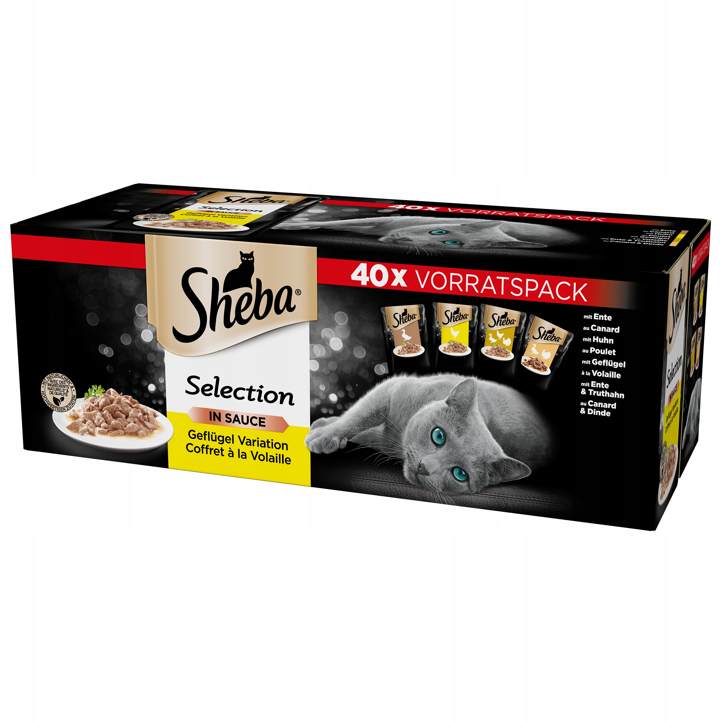 Вологий корм для котів SHEBA® Selection in Sauce Poultry Flavors — це набір пакетиків із вибором чудових смаків: з качкою, з куркою, з птицею, з качкою та індичкою.