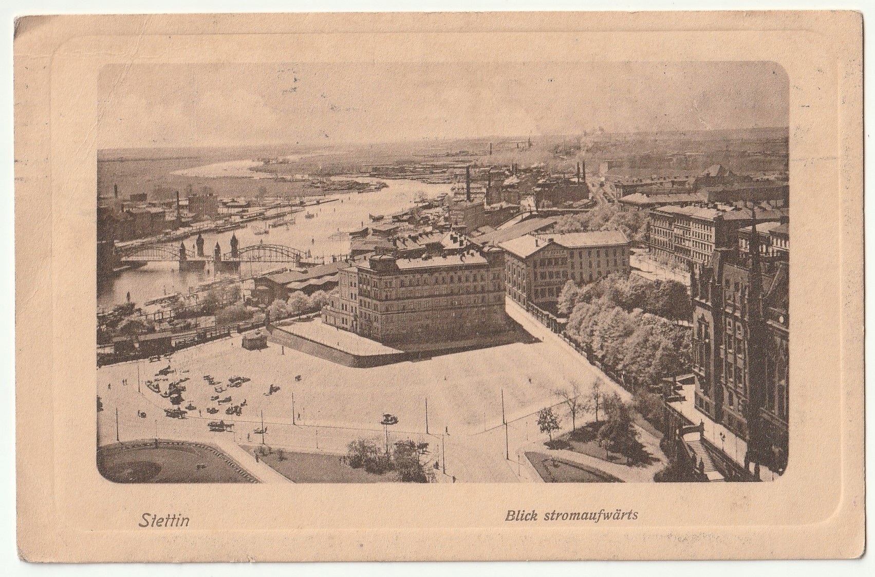 ЩЕЦИН. Панорама під ред. до 1910 року; Ч/Б, дрібні плями та бруд, невеликий загин у лівому верхньому куті, стан хороший, з тиражу. Штеттін. Blick stromaufwärts.