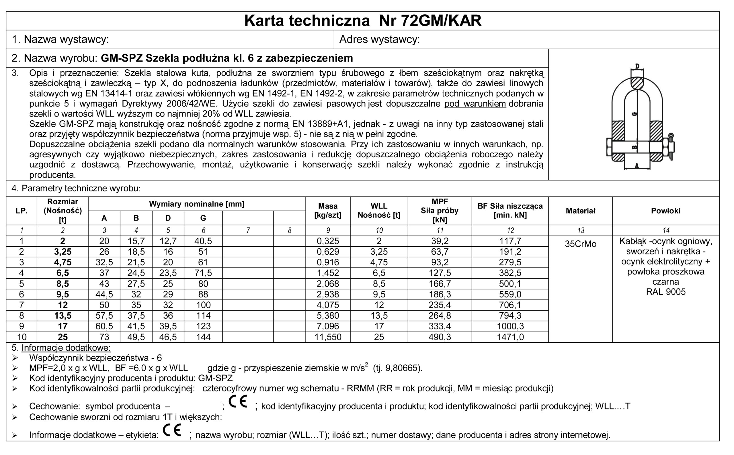 - Кована сталева скоба, подовжена з гвинтовим штифтом з шестигранною головкою та шестигранною гайкою та шплінтом типу X, для підйому вантажів (предметів, матеріалів і вантажів), також для сталевих канатних строп відповідно до EN 13414-1 та волокна стропи відповідно до EN 1492-1, EN 1492-2, з точки зору технічних параметрів, наведених у пункті 5, і вимог Директиви 2006/42/EC. Використання дужок для ременних строп дозволяється за умови, що скоби вибрані зі значенням WLL щонайменше на 20% вище, ніж WLL стропа