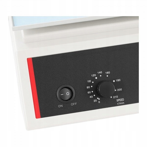 Шейкер переконує своєю амплітудою вібрації до 22 мм, що разом із високою швидкістю обертання забезпечує ефективне змішування. Швидкість регулюється від 0-210 об/хв. Управління дуже зручне завдяки зрозумілій панелі керування. Крім того, пристрій оснащений таймером (0-60 хв), який гарантує підтримку відповідного часу, необхідного для виконання заданого процесу.
