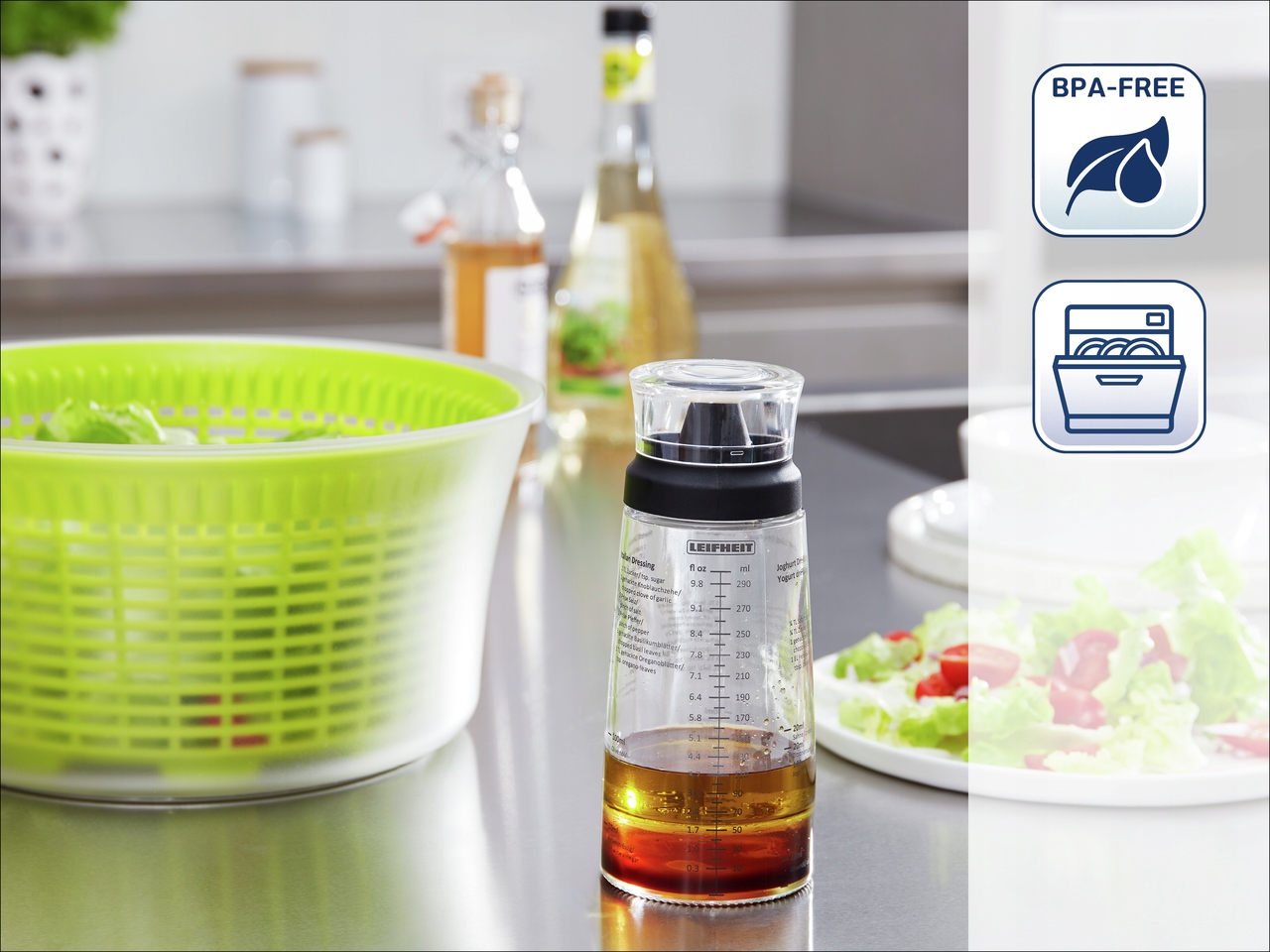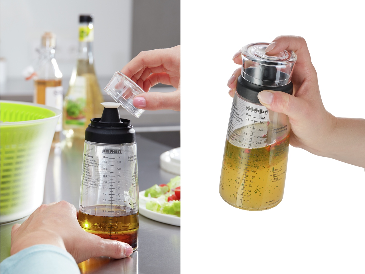 Ємність шейкера для соусу та заправки Leifheit становить 300 мл. У ній також зручно приготувати велику кількість соусу. Завдяки кришці дана модель підходить для зберігання готових харчових добавок.