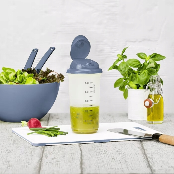 Прозора чашка має об’єм 0,5 літра, її можна безпечно закрити за допомогою кришки з вбудованим носиком. Завдяки зручній для читання вимірювальній шкалі заправки або напої можна готувати безпосередньо в чашці, колесо змішування забезпечує оптимальне змішування. Кружка виготовлена з міцного високоякісного переробленого пластику, який виготовлений екологічно чистим способом і не містить шкідливих речовин. Його легко чистити та можна мити в посудомийній машині. Використовуйте цей гнучкий шейкер, який робить здорове харчування легким!