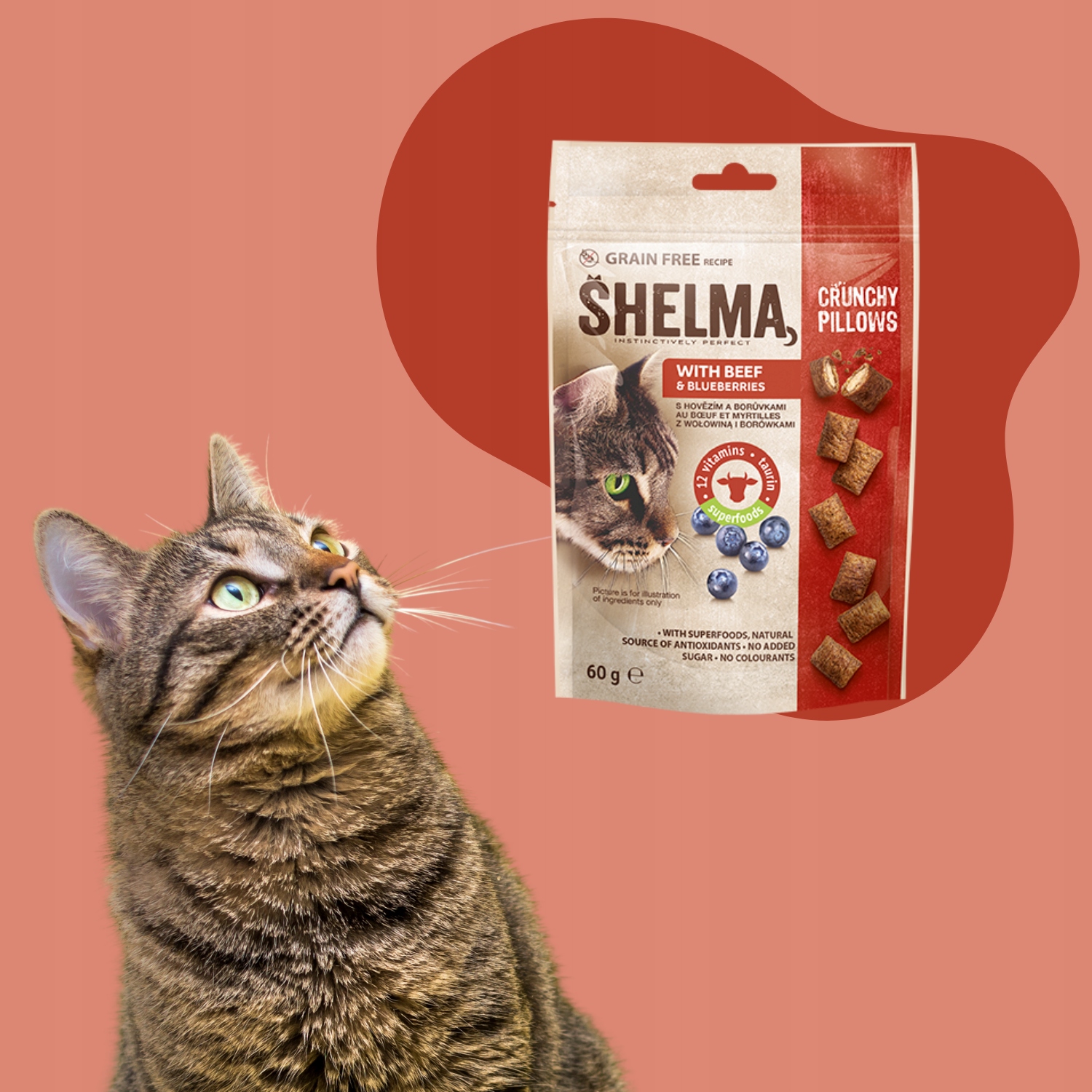 SHELMA СНЕКСИ ДЛЯ КОТІВ БЕЗЗЕРНОВІ ХРУСТКІ ПОДУШКИ 60Г ЯЛОВИЧИНА ЧОРНИЦЯ