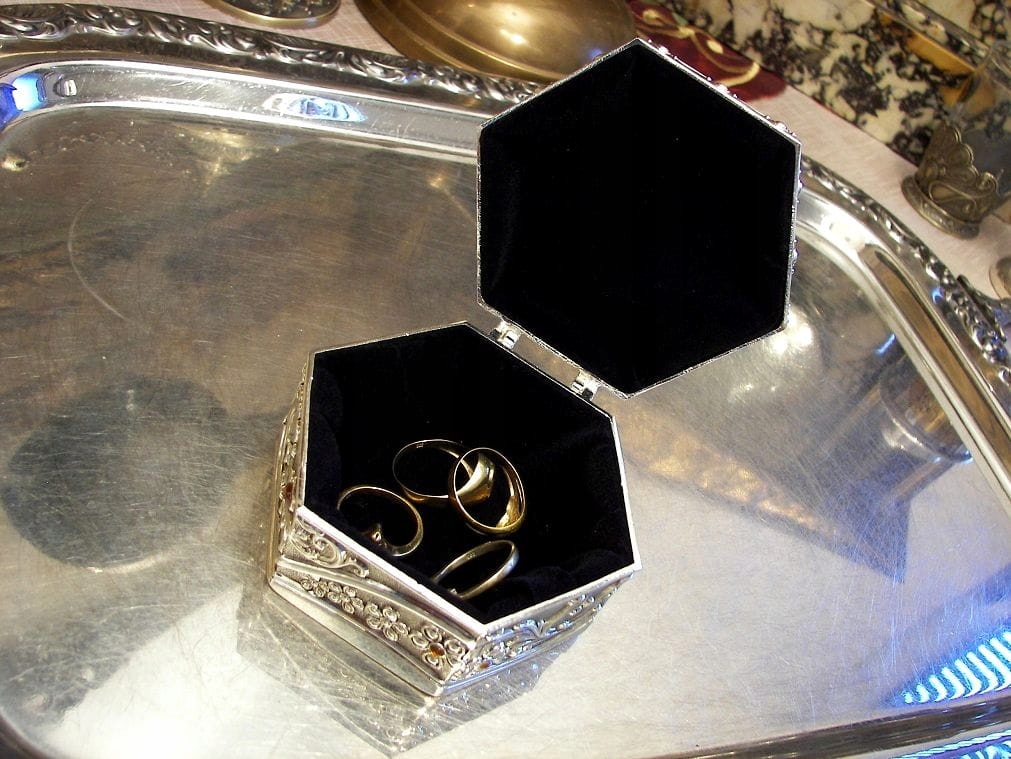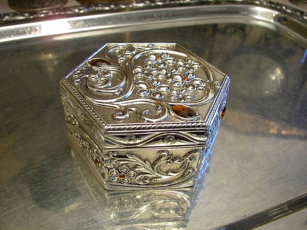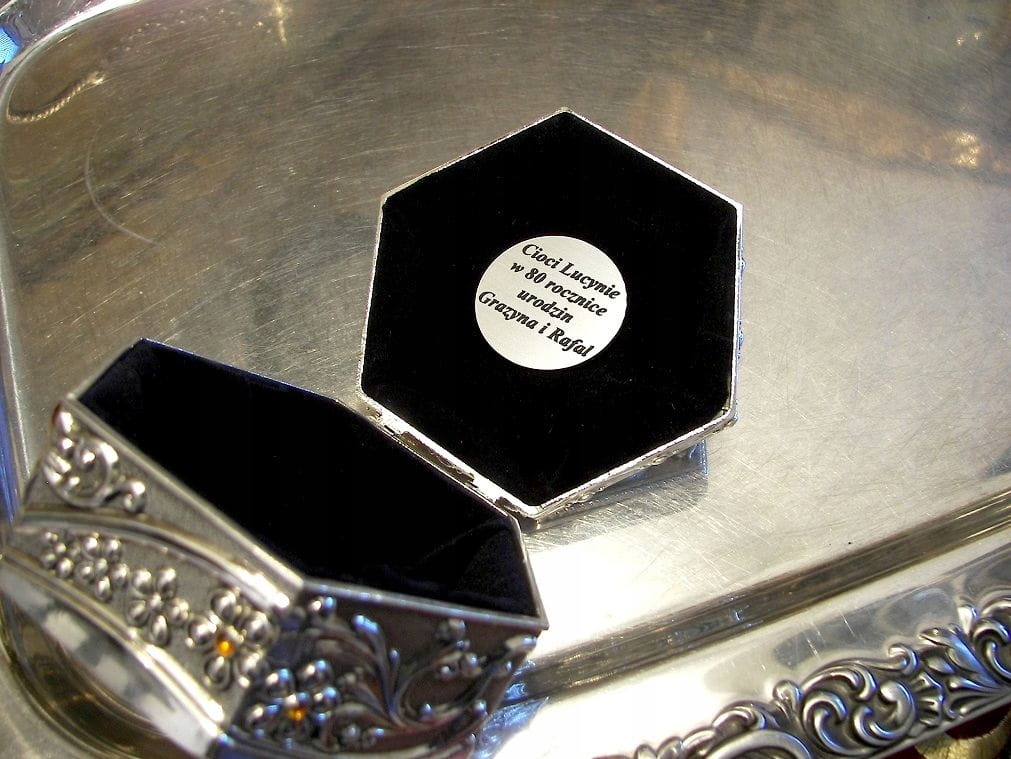Я запрошую вас придбати прекрасну, незвичну коробку. Цікавий предмет, шестикутник, з ефективними, опуклими прикрасами. Елемент, виготовлений з цинкового сплаву, покритий сріблом. Стилізований. Оплачені субсидіями Allegro Об'єкт з гравіруванням повинен бути сплачений заздалегідь і не підлягає поверненню