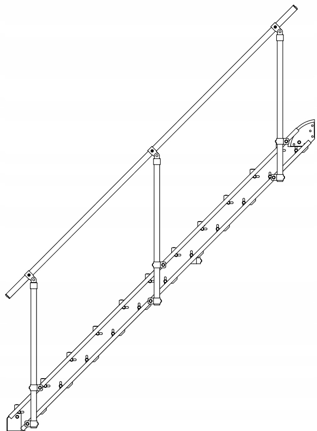1. Встановіть перший і останній ступінь на бічні промені, залишаючи невелику слабкість на гвинтах, що допоможе закріпити наступні кроки. Зробіть монтажні отвори в структурі стіни або платформи. Потім встановіть дугові захватки і ковзайте конструкцію. Зробіть отвори в опорних променях через отвори в дузі. Поверніть ручки з променями, залишаючи невелику слабкість. Потім підсуньте конструкцію на ноги і виберіть свердлові отвори. Стопи стопи до землі. Зробіть отвори в опорних променях через отвори в ногах. Поверніть ноги балками. Встановіть решту сходів до бічних рейок і рівня. Потім добре затягніть з'єднання.