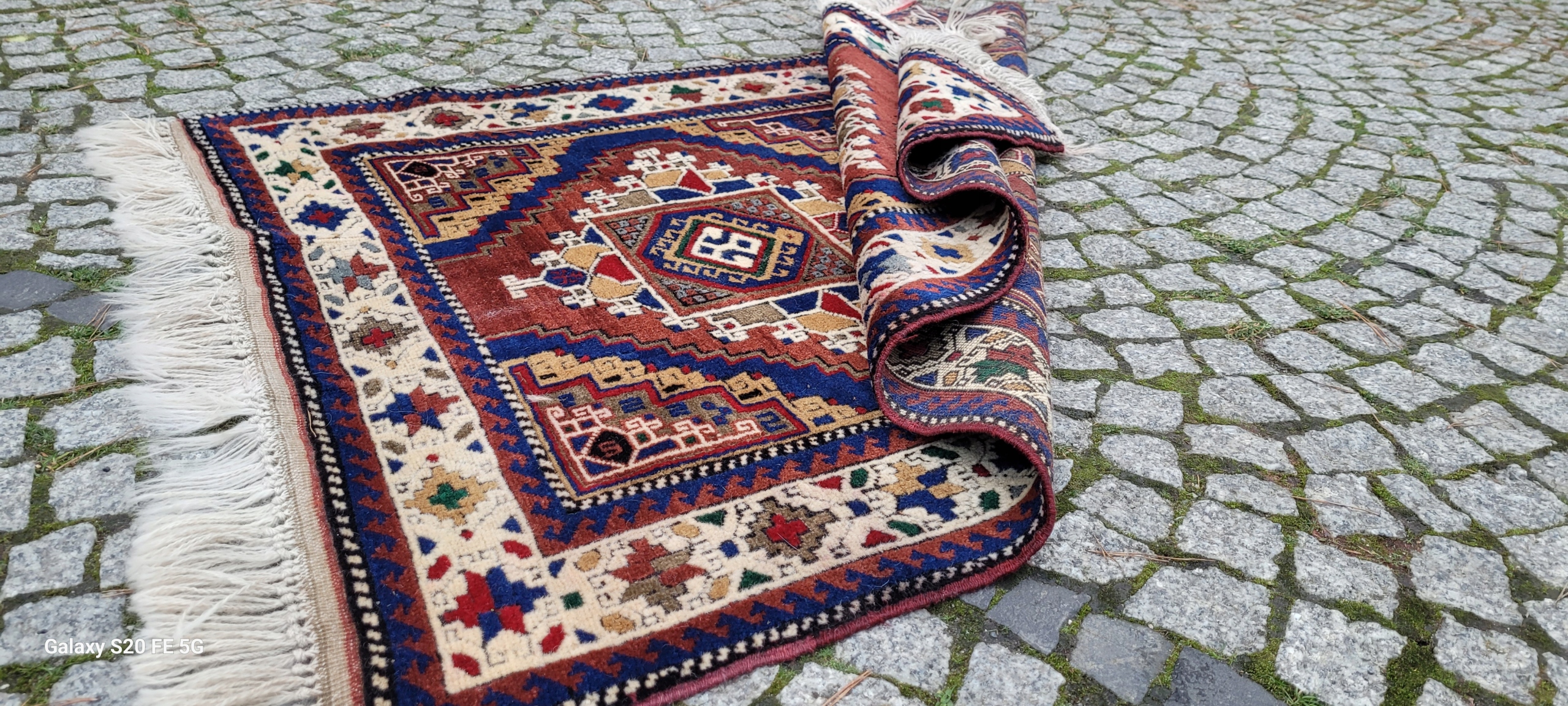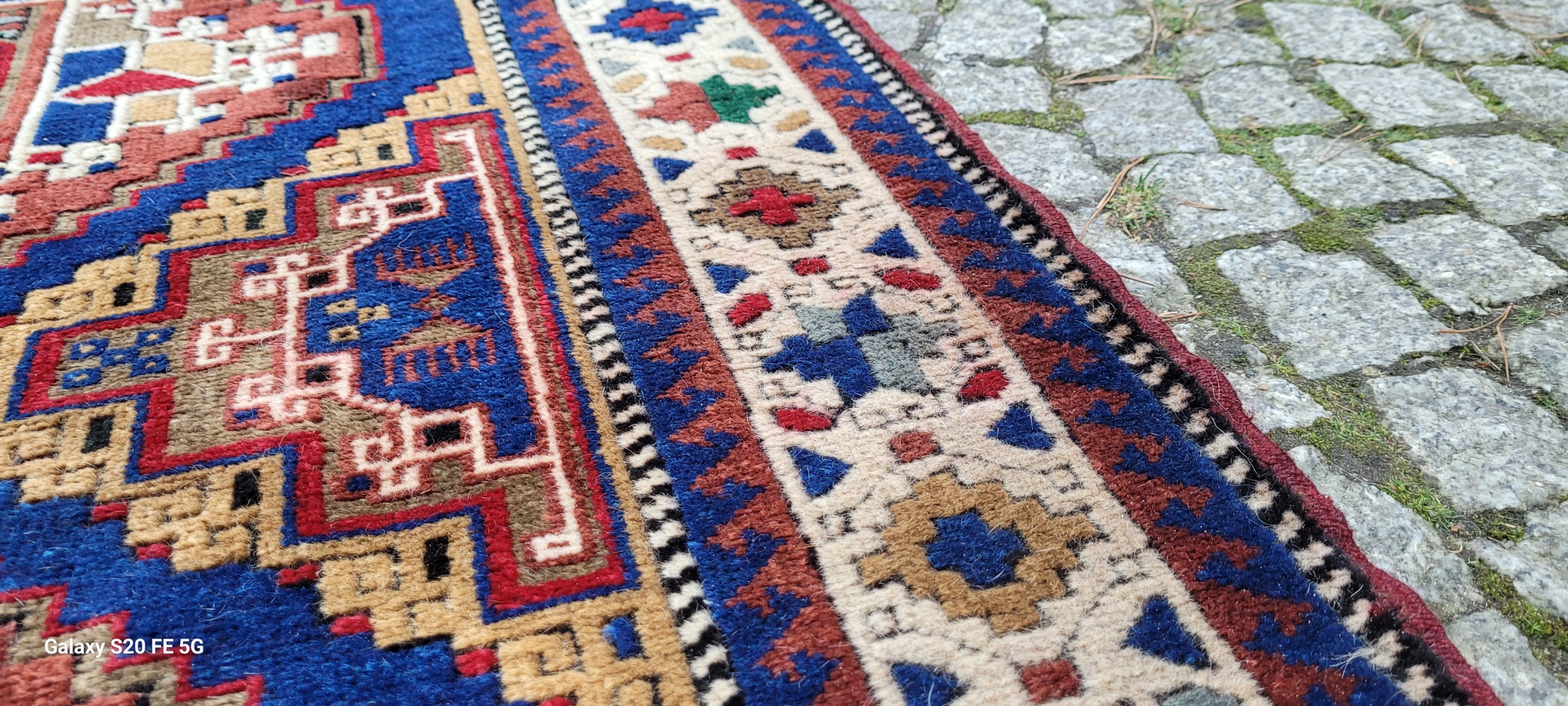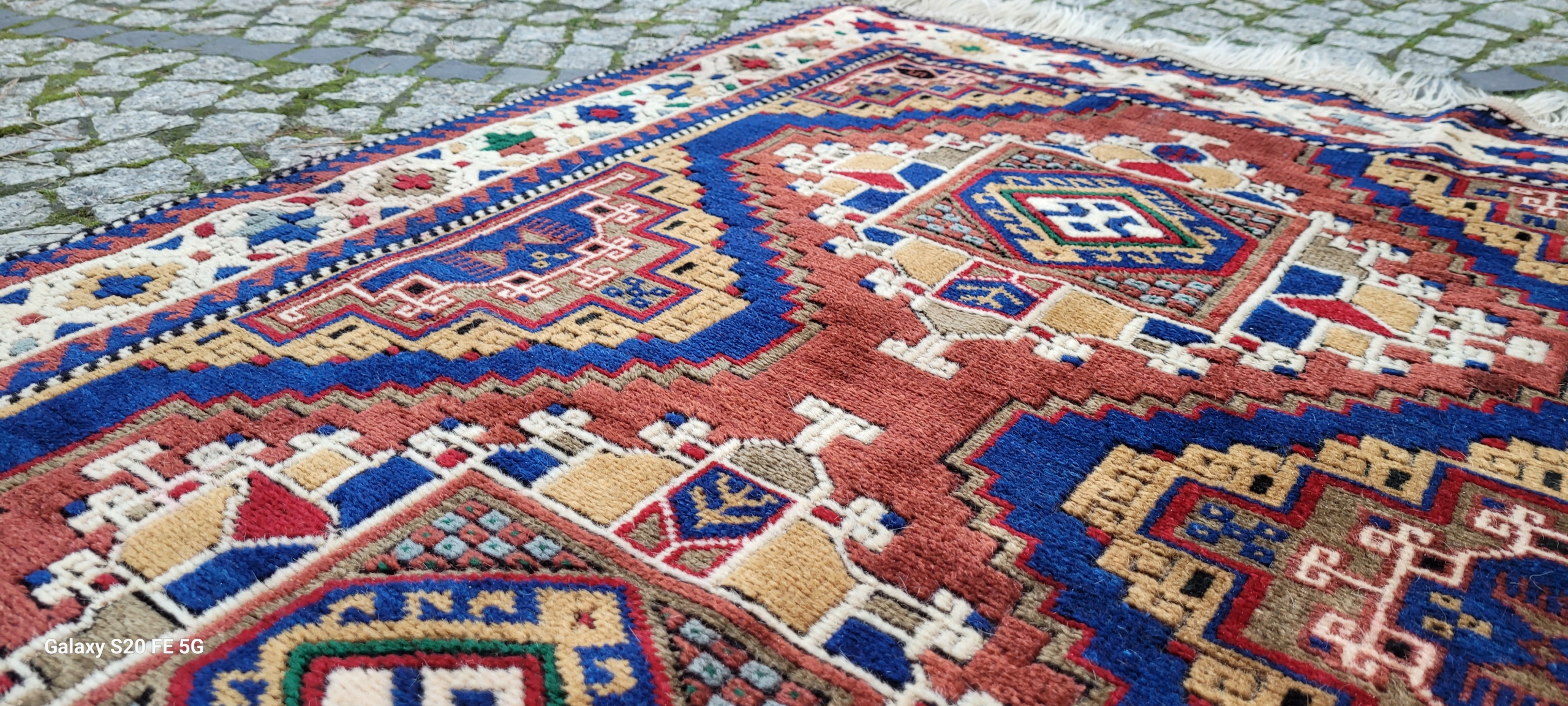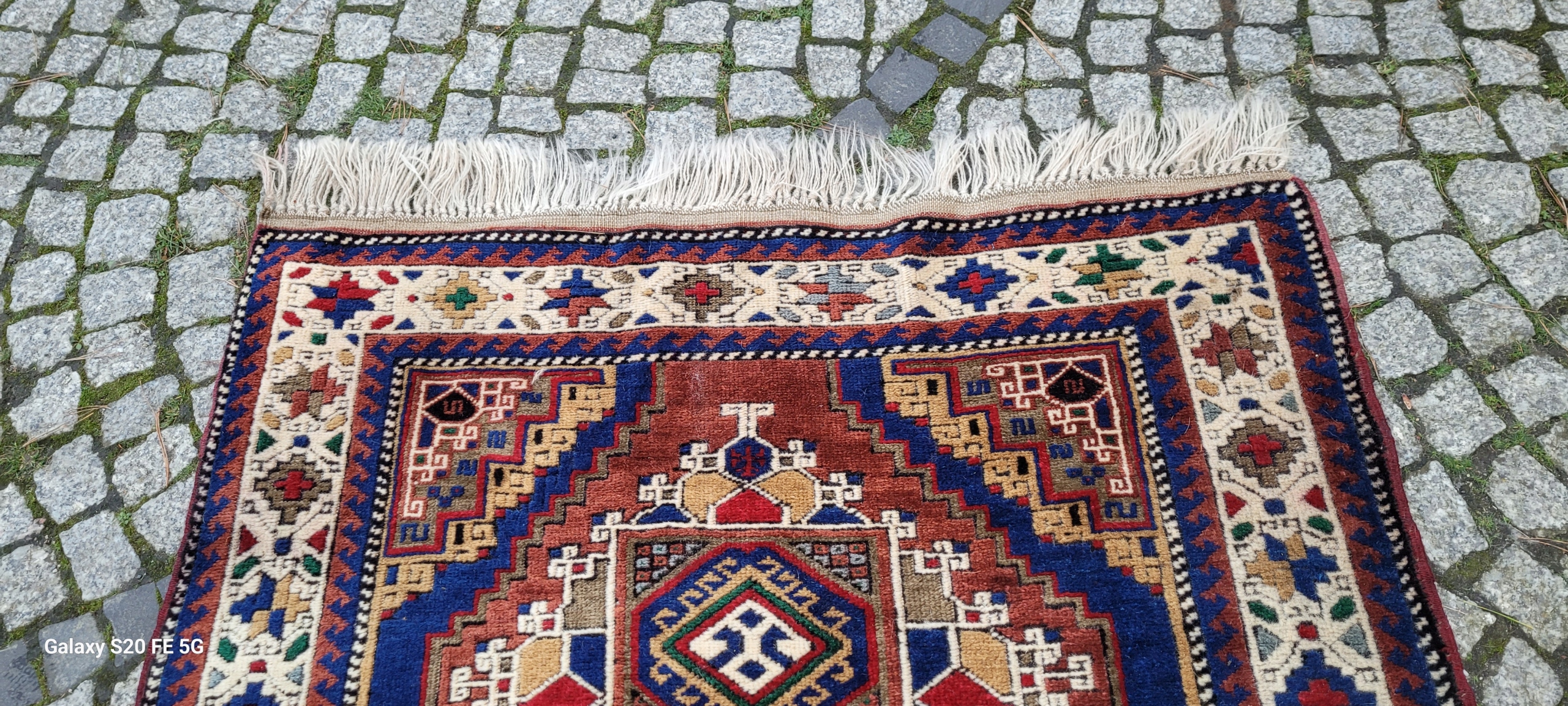 Анатолійський казахський килим. Виткана вручну з високоякісної вовни. Характеризується щільним флісом, красивими кольорами та візерунками. В хорошому стані, видно на фото. Має місця з міграцією барвника.