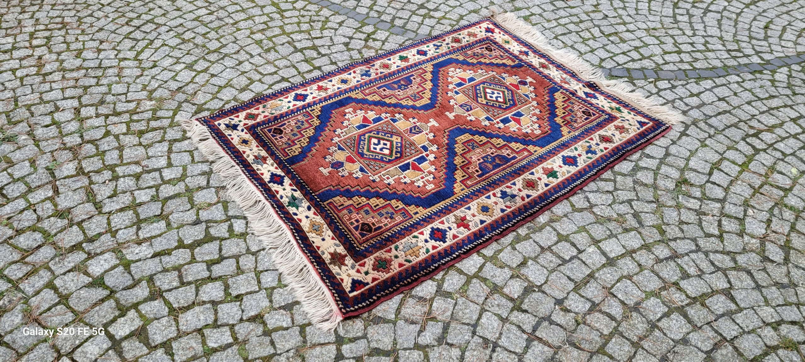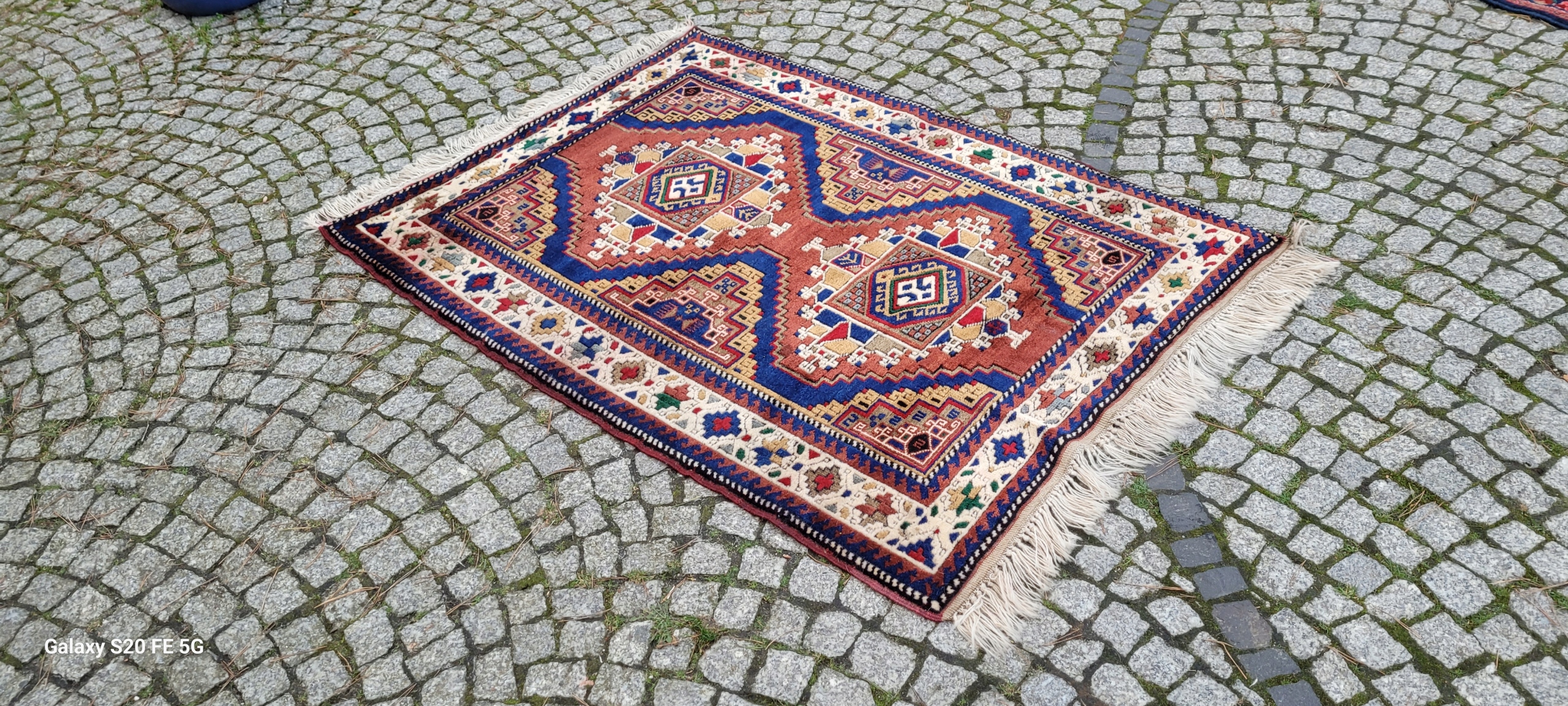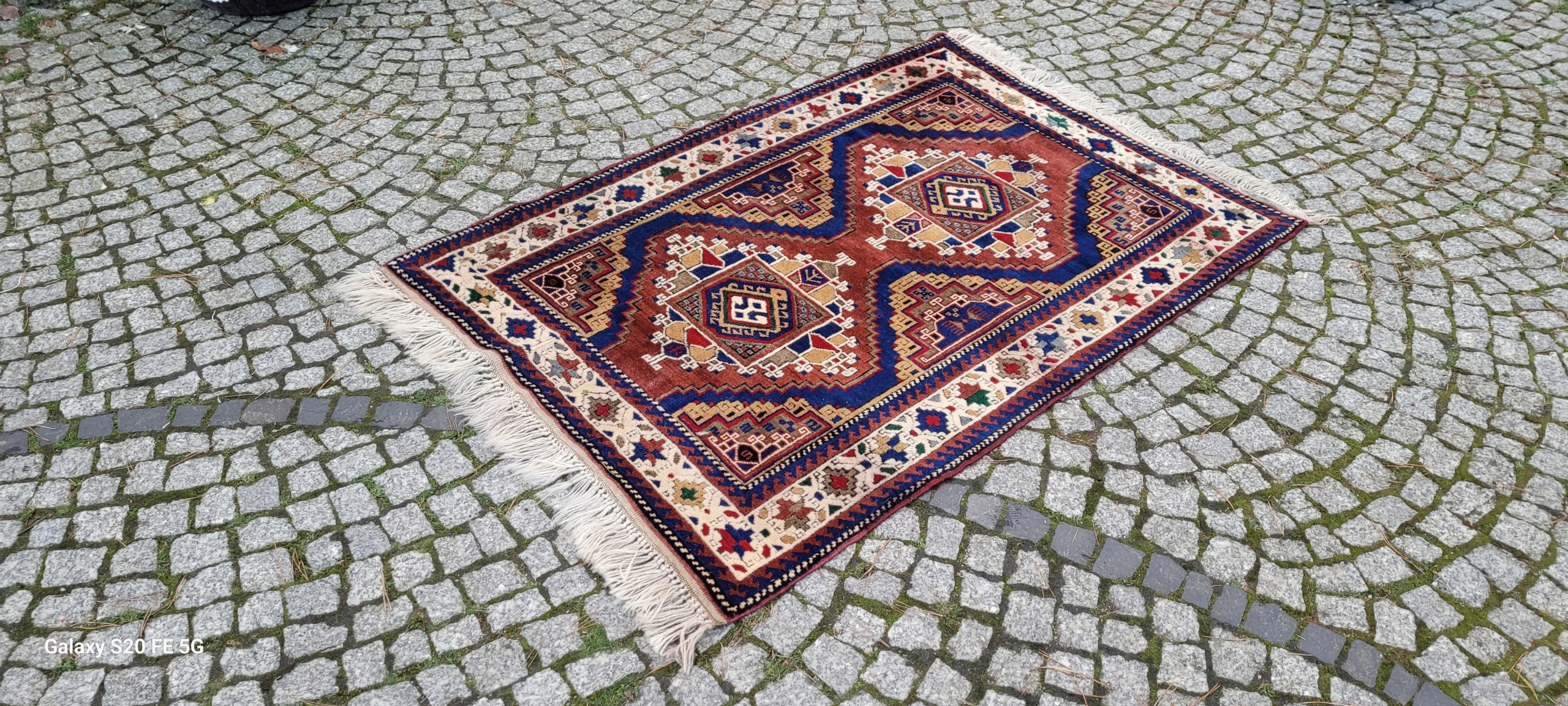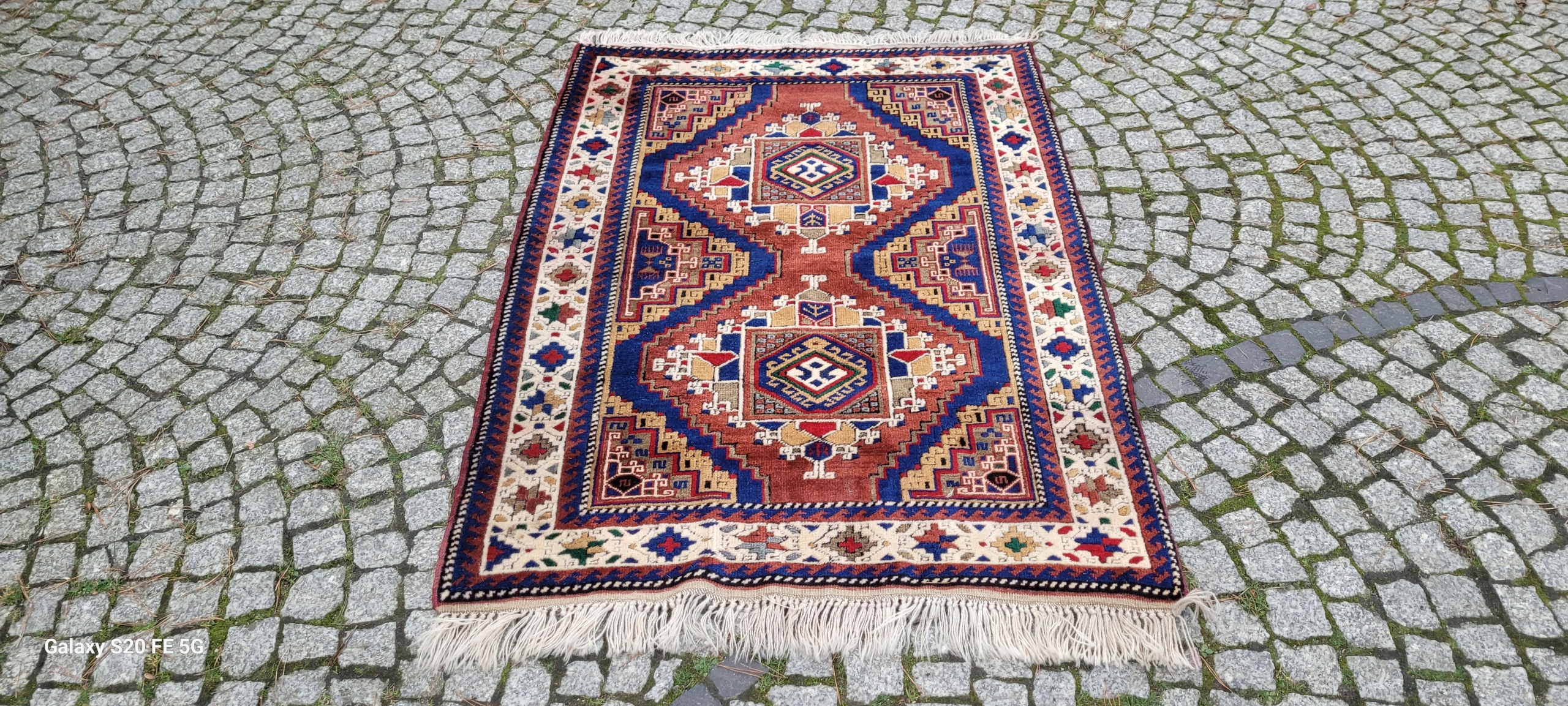 Анатолійський казахський килим. Виткана вручну з високоякісної вовни. Характеризується щільним флісом, красивими кольорами та візерунками. В хорошому стані, видно на фото. Має місця з міграцією барвника.