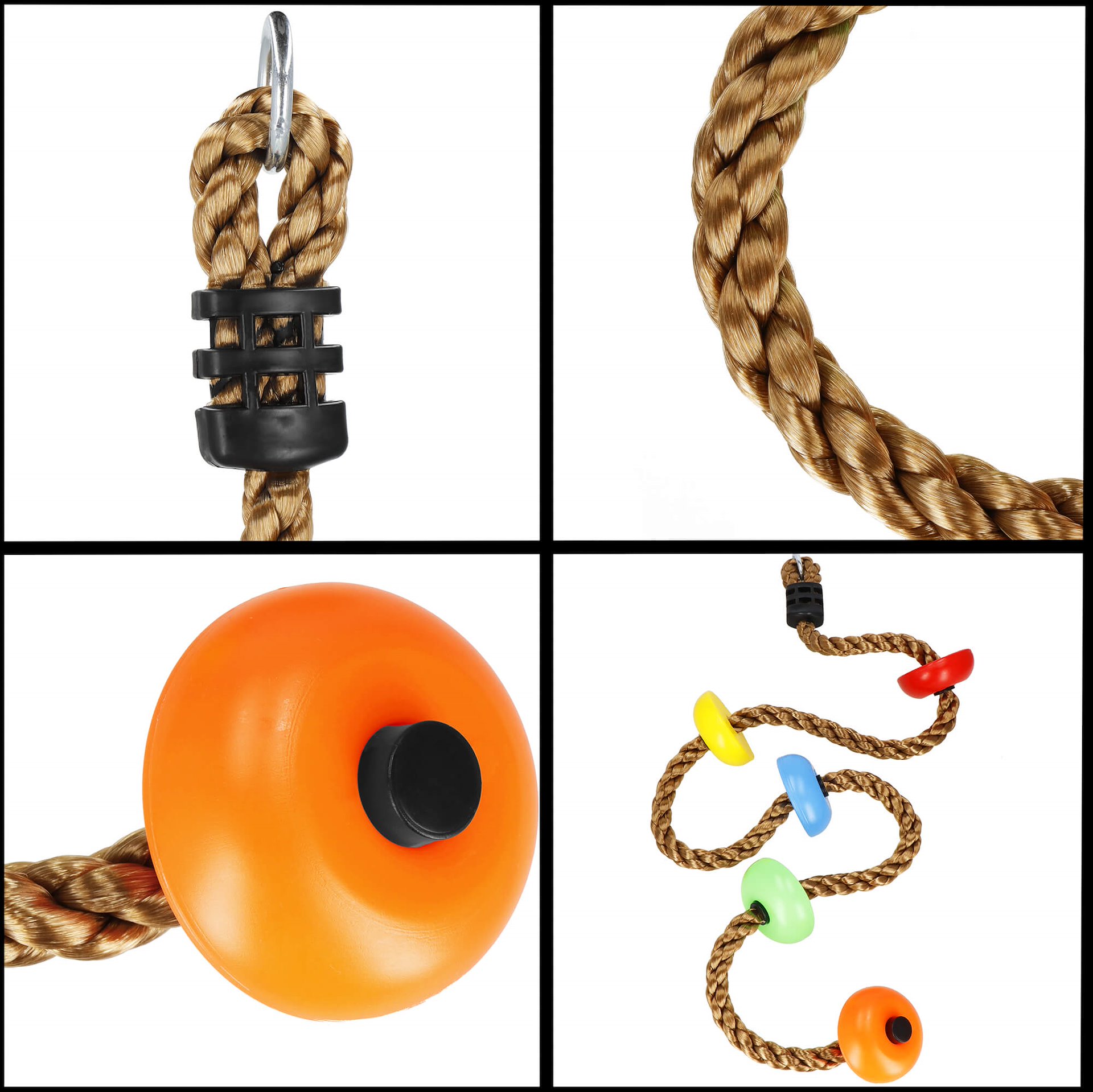 З огляду на те, що веселощі також були дружні батьки , ми збільшили ступінь безпеки у нашому наборі. Для виробництва ми використовували надзвичайно міцні та довговічні матеріали , а платформи додатково покриті грубою , non -slip поверхнею. Кінчик мотузки був обладнаний пластиковим елементом, який запобігає загоєнню .