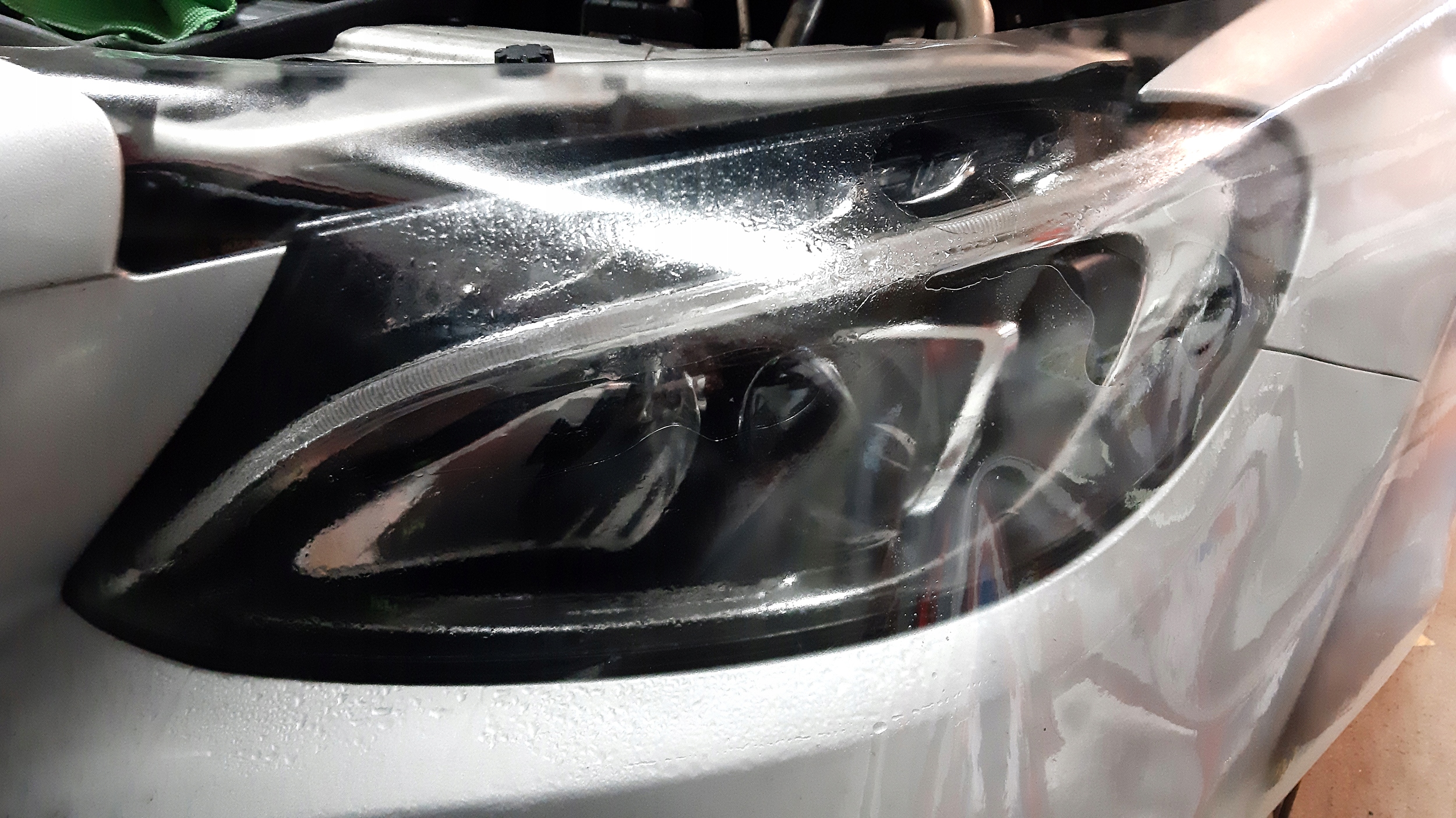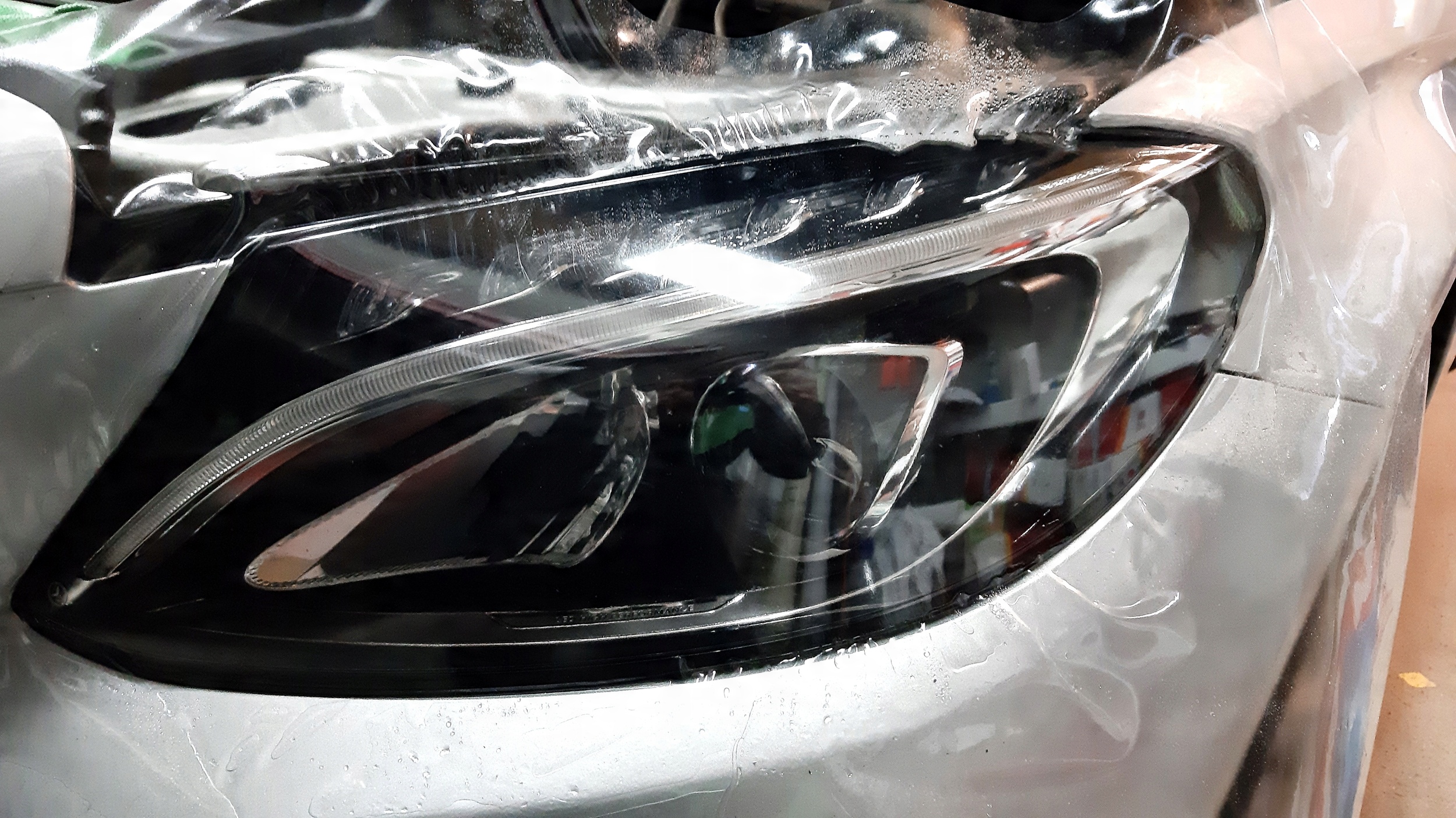 Після нагрівання фольга стає більш пластичною і її можна клеїти на злегка закруглені елементи. Нижче наведено приклад нанесення на фари Mercedes C-класу, які, як видно на другому фото, дуже закруглені і залишають великі надлишки фольги як у верхній, так і в нижній частині лампи.