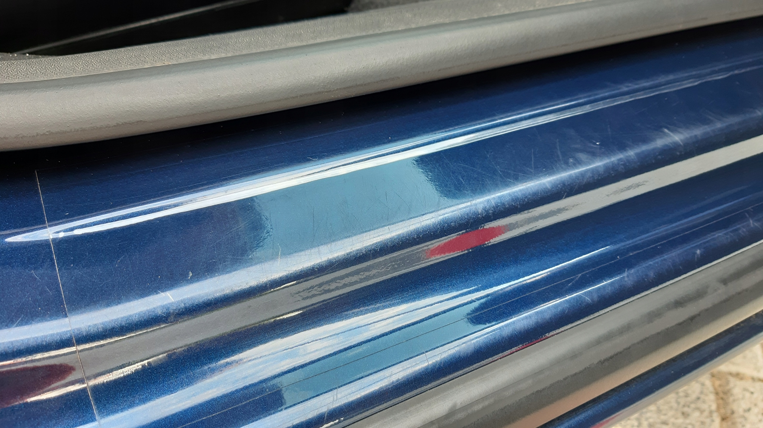 Нижче подаємо фотозвіт із заміни фольги на поріжку автомобіля. Фольга після майже 1,5 років інтенсивного використання (через брудне взуття 5-річного хлопчика, який самостійно сідав і виходив з машини) була замінена. Фольга ніде не зламана, заміна була продиктована естетичними міркуваннями. На фото без фольги поріг автомобіля, на який плівка не наклеювалася 7 років, тому є дрібні подряпини.