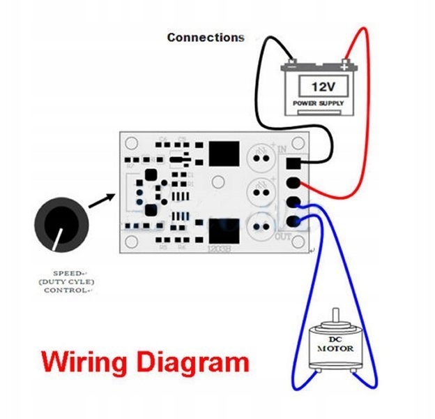 Підключіть джерело живлення 6–28 В постійного струму до клем, позначених як Power - і Power +, дотримуючись правильної полярності. Підключіть приймач (наприклад, двигун постійного струму) до клем Motor - і Motor +. За допомогою потенціометра регулюйте, наприклад, швидкість обертання підключеного двигуна постійного струму.