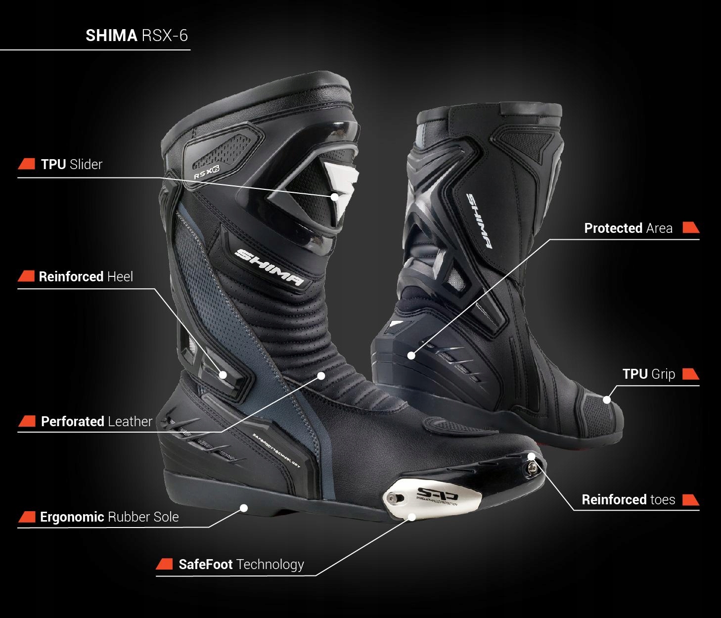 Взуття RSX-6 – це спортивне взуття з ергономічним дизайном, що адаптується до положення мотоцикліста. Збоку є слайдер TPR. Поперечно посилена підошва в системі SafeFoot. Спеціальна синтетична накладка, розміщена в передній частині черевика, дозволяє точніше керувати важелем коробки передач.
