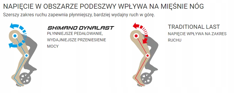 Передня, піднята частина велосипедного взуття відіграє ключову роль у забезпеченні ефективної педалювання. Коли він занадто піднятий, це викликає більшу напругу підошовних м’язів, литних м’язів та підколінних сухожиль. Якщо він занадто низький, педалювання втрачає продуктивність, а велосипедист ризикує травмувати. Комплексні дослідження експертів Shimano з Департаменту досліджень та розробок дозволили створити ідеальну форму взуття з оптимізованим пальцем ноги, що дозволяє більш гладким, ефективнішим рухом вгору. Дизайн Shimano Dynalast, створений на основі думок професіоналів, допомагає зменшити зусилля під час довгих маршрутів, що дозволяє останній спринт до фінішної лінії.