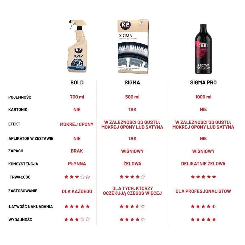K2 SIGMA PRO - блиск і захист, захист і блиск - унікальне, ідеальне поєднання. Суміш благородних олій, синтетичних полімерів і поживних інгредієнтів, створена тріо майстрів, щоб надати неземного блиску і надзвичайно глибокого, нескінченного чорного - ефекту мокрої шини.