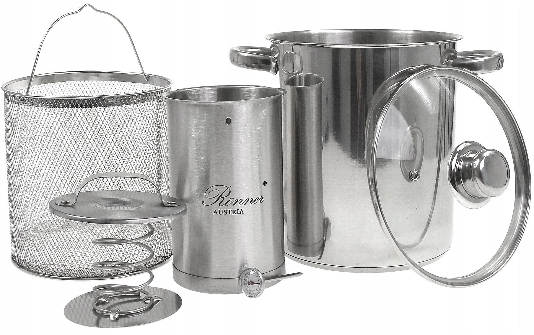Набір шинковарки RONNER AUSTRIA з термометром 1,5 л, каструлею з ситечком 4,2 л і пакетами дозволяє самостійно готувати різні види нарізок і насолоджуватися їх натуральним смаком. Це також м’ясні продукти без консервантів, наповнювачів та підсилювачів смаку. Завдяки цьому ви подбаєте про здоров'я своїх близьких. Елементи з нержавіючої сталі і практична каструля з термометром прискорять і покращать приготування страв, не тільки м'ясних.