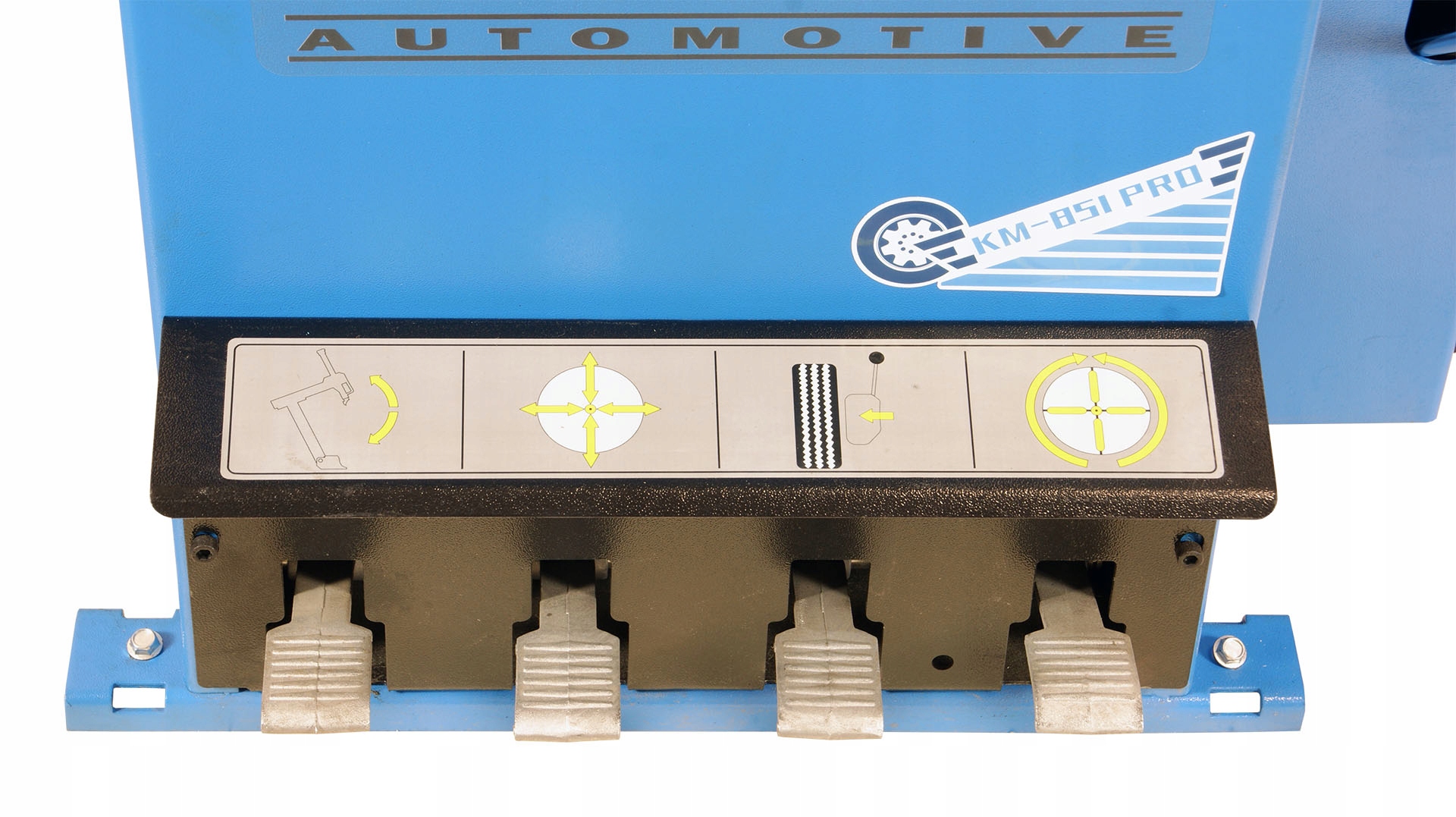Шиномонтажний станок KM-851 PRO призначений для коліс діаметром до 24 дюймів (внутрішнє кріплення обода). Крім того, ця модель має стіл із чотирма губками, керованими міцними та надійними приводами. Машина характеризується високою якістю механізмів управління як електричною, так і пневматичною установкою. Використовуваний в KM-851 PRO привід розриву бортів дозволяє отримати зусилля 2700 кг, а його профільована форма значно полегшує демонтаж шини.