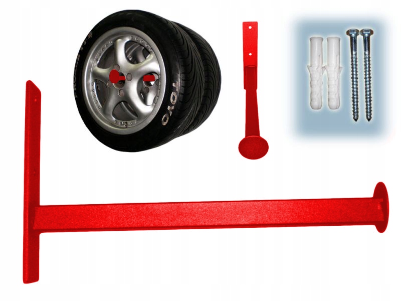 Вішалка використовується для підвішування двох шин b> або автомобільні колеса. Рука довжиною 350 мм виготовлена із сталевого профілю поперечного перерізу, що закінчується сталевим диском діаметром 50 мм. Основа виготовлена з листової сталі. Вішалка пофарбована порошковою фарбою червоного кольору. Підбір відповідних матеріалів робить вішалку дуже стійкою та естетично виконаною. Він прослужить багато років і буде підтримувати порядок у вашому гаражі. Вішалка може мати й інші застосування.