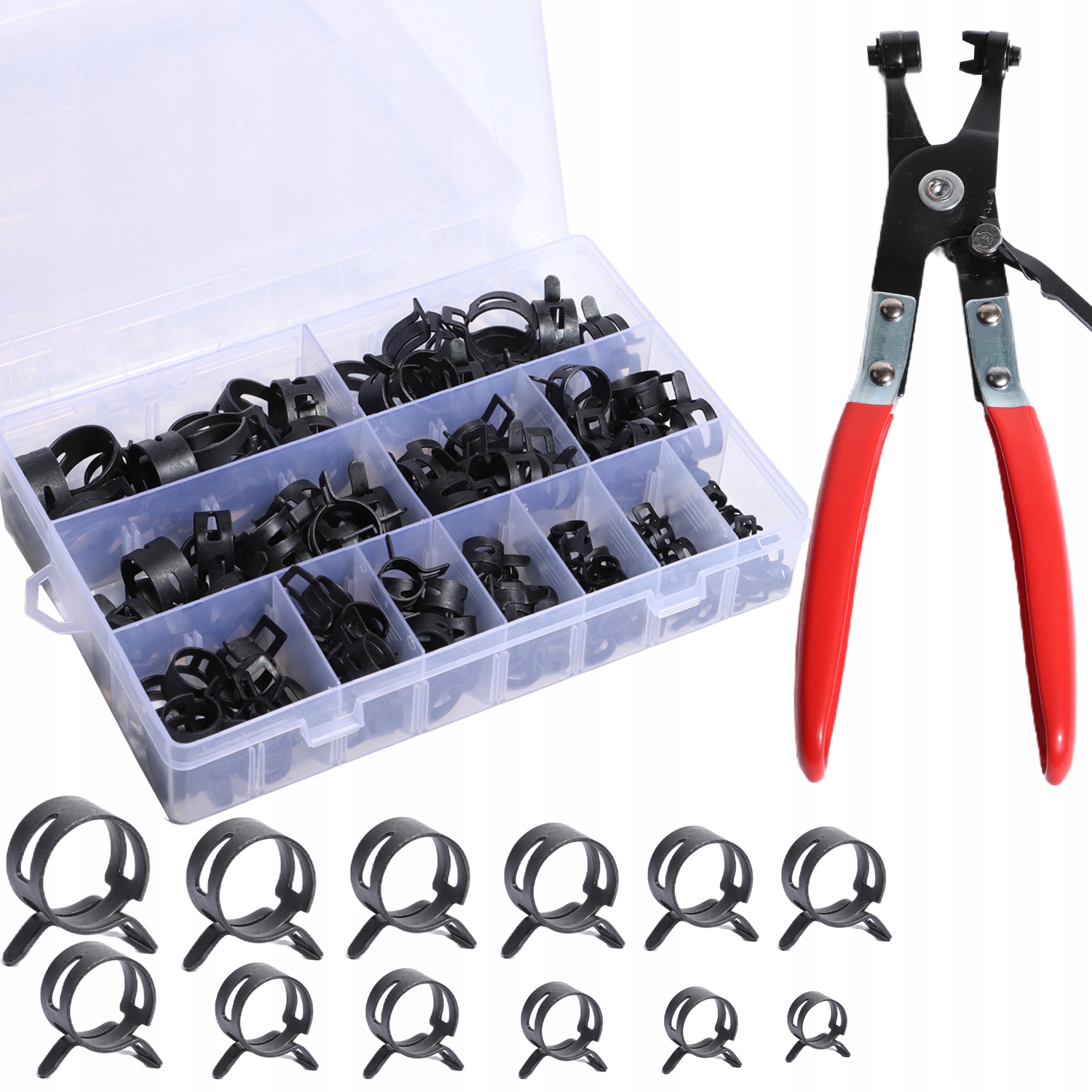 Набір містить 120 пружинних затискачів12 розмірів (7/8/9/10/11/12/14/15/16/18/20/22 мм) – 10 штук кожного розміру, ідеально підходять для шлангів і труб різного діаметру. Крім того, додається плоскогубці, що обертаються, для легкого збирання та розбирання. Все це упаковано в зручну коробку для зберігання.