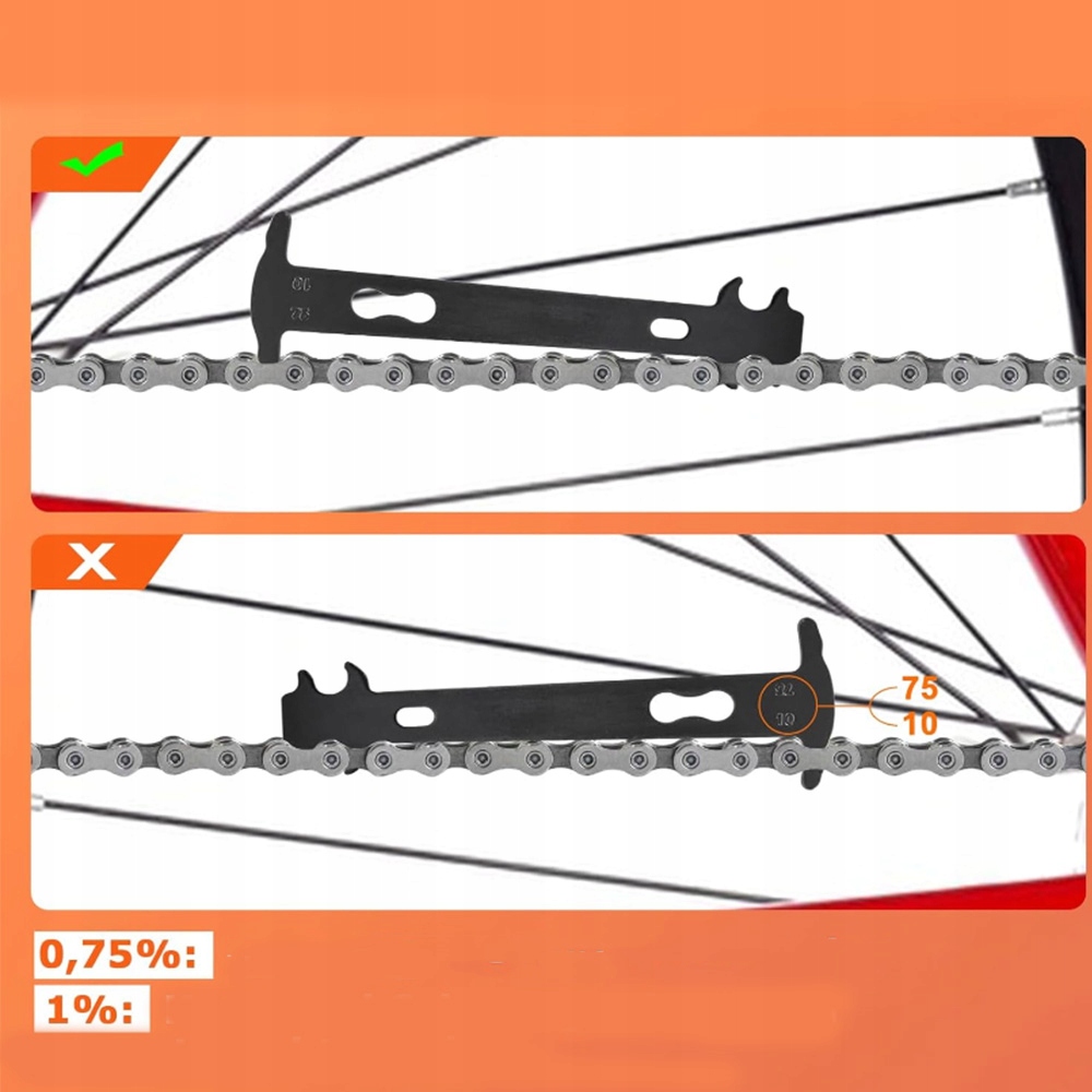 Велосипедний манометр для швидкого й легкого вимірювання зносу та допоможе вирішити, чи варто замінити ланцюг на новий. Він виготовлений із загартованої сталі та має два класи точності: 0,75% і 1%. Якщо довжина перевищує 0,75%, ланцюг необхідно замінити, якщо ланцюг повністю заблокований на 1%, ланцюг необхідно замінити (також потрібно замінити маховик).