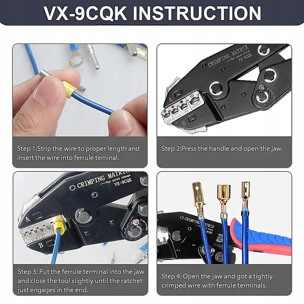 Багатофункціональний інструмент для обтискання: можна використовувати для ізольованих та неізольовані контакти, термоусадочні з’єднувачі, кінці кабелів і сонячні клеми.